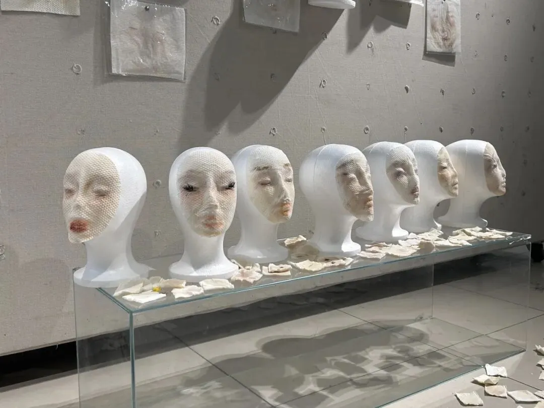 作品简介:女性在不同社会情境中,面孔如何被反复调用和使用。我选取了一些被普遍认为”重要或特殊”的场合,比如第一次面试、约会、纪念日等,收集女性在这些情境中所化的妆,并通过“卸妆”这一行为将妆容从面孔上转移出来。此作品并不是在讨论美或个人表达,而是在呈现:面孔如何在不同情境中被要求出现、被使用,最终只留下痕迹。