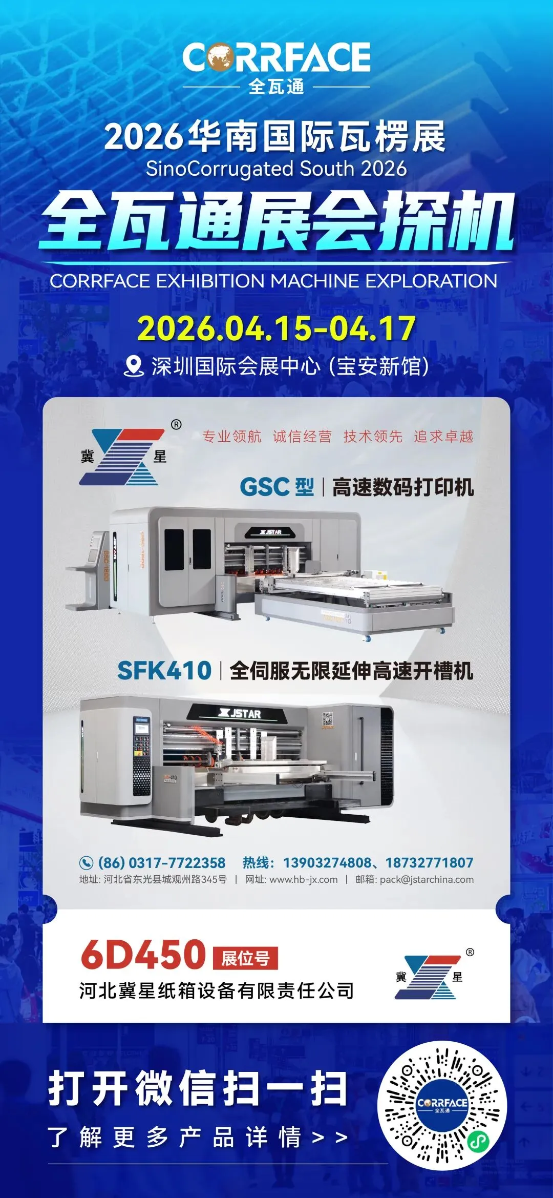 2026华南国际瓦楞展将于4月15日-17日在深圳国际会展中心(宝安新馆)重磅举行。河北冀星纸箱设备有限责任公司邀您莅临6馆-D450展位咨询了解,见证冀星“GSC型高速数码打印机”及“SFK410全伺服无限延伸高速开槽机”的精彩表现。