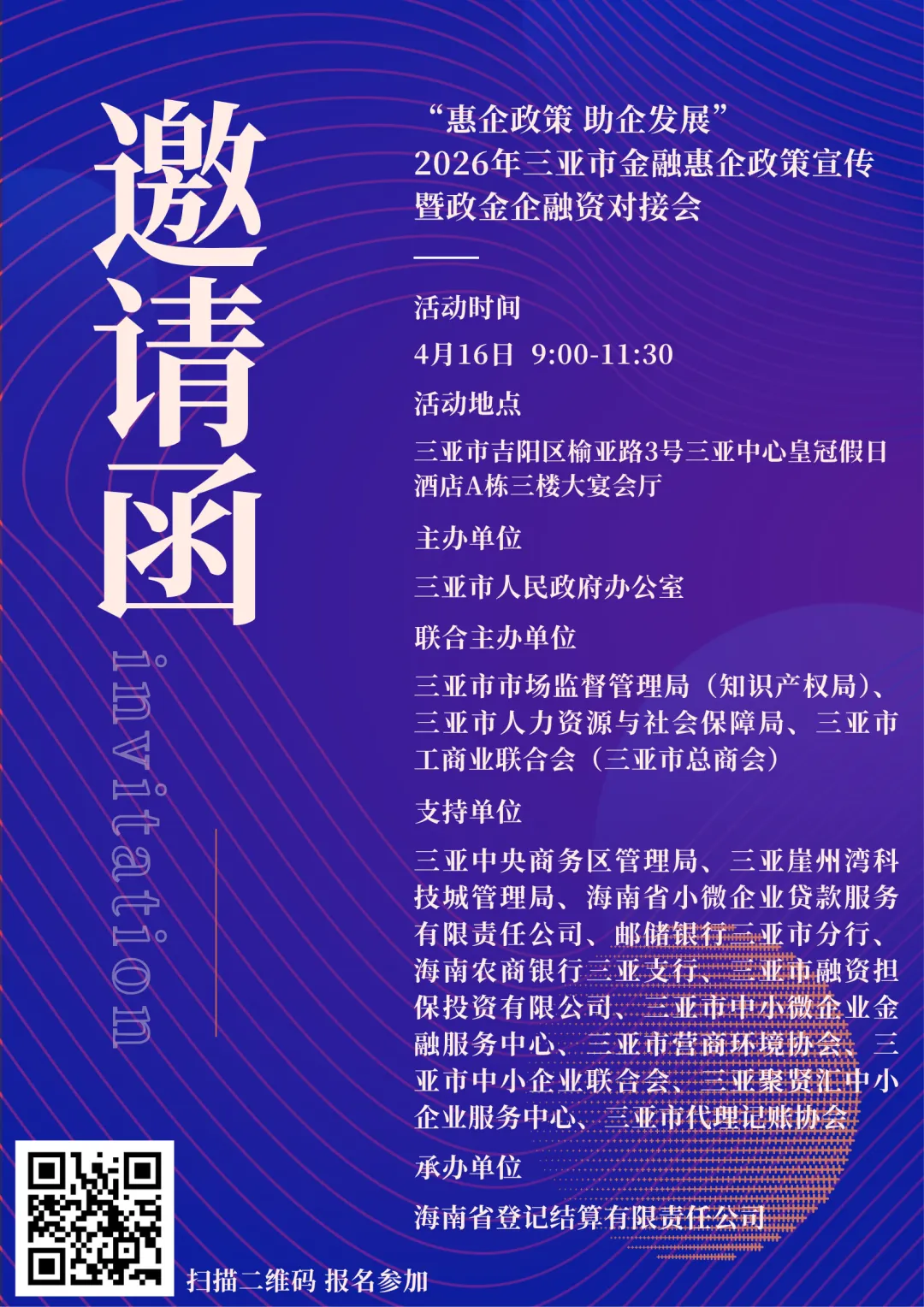 4月16日上午,由崖州湾科技城管理局支持的“惠企政策 助企发展”2026年三亚市金融惠企政策宣传暨政金企融资对接会将在三亚市吉阳区榆亚路3号三亚中心皇冠假日酒店A栋三楼大宴会厅举办,欢迎科技城内有融资需求的民营企业、个体工商户及中小微企业等市场主体报名参会。
