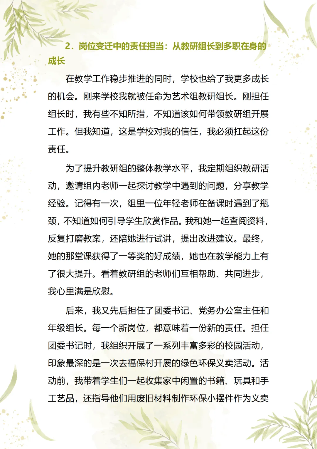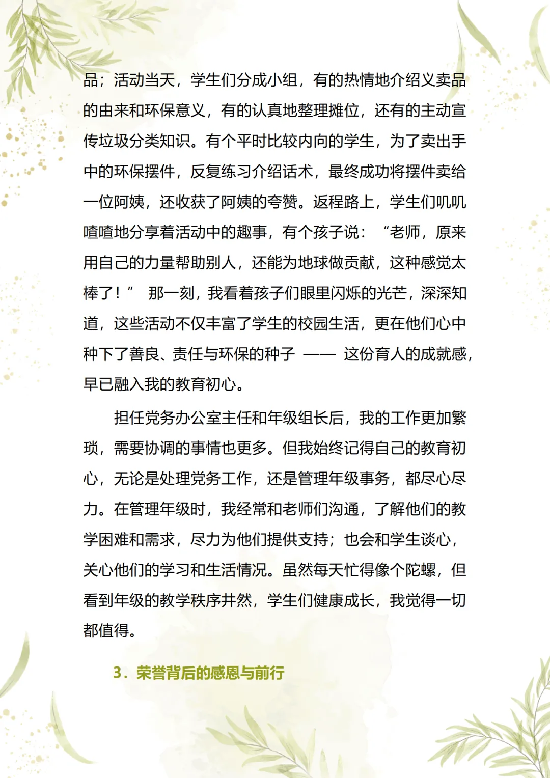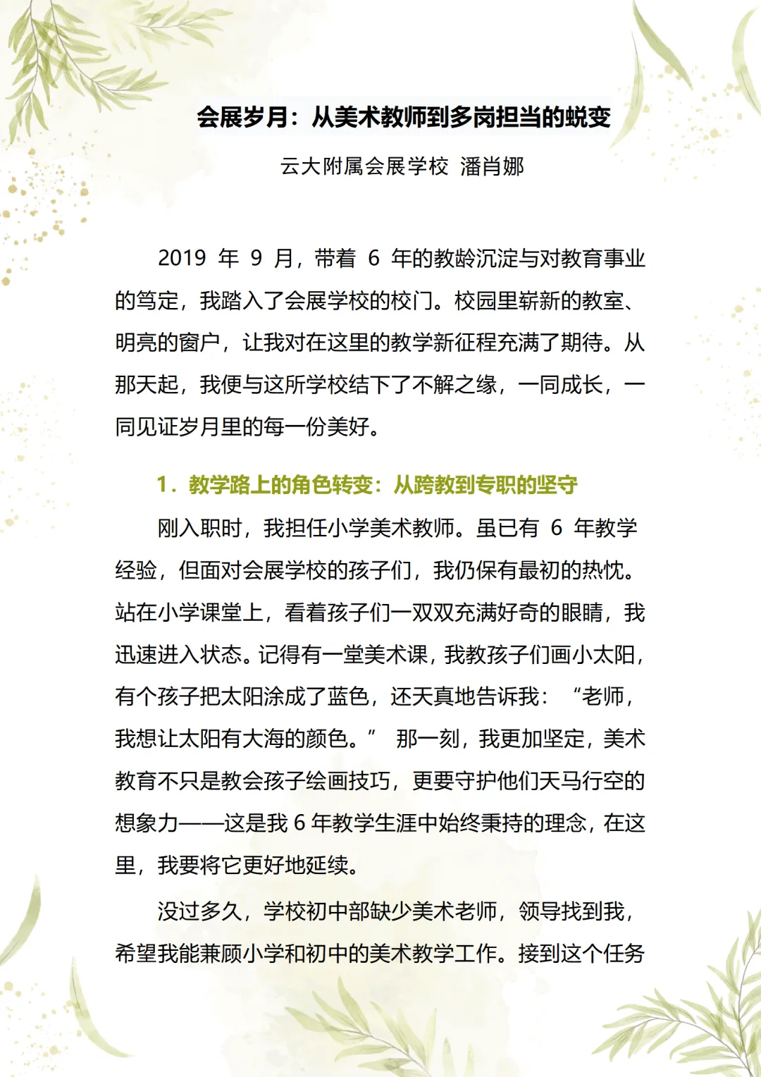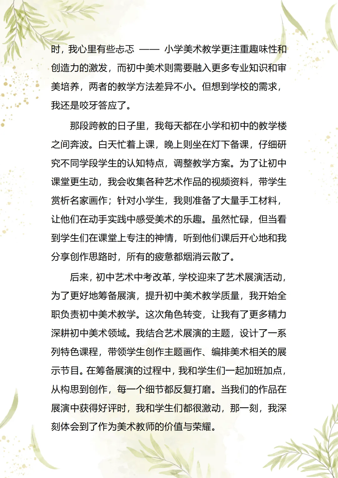 从美术教师到多岗担当,潘肖娜老师用六年教龄的沉淀踏入会展。她跨教小学与初中,在蓝色太阳的想象里守护童心;又扛起教研组长、团委总支书记、年级组长的重任。印象最深的是那次环保义卖,内向的孩子反复练习话术,最终卖出环保摆件,眼里亮起光芒。从艺术展演的打磨到党务工作的琐碎,她始终记得:每一份荣誉背后都是团队的托举,每一次角色转变都是成长的勋章。如今回望,那些奔波的日子早已化作教育路上最坚实的足迹。