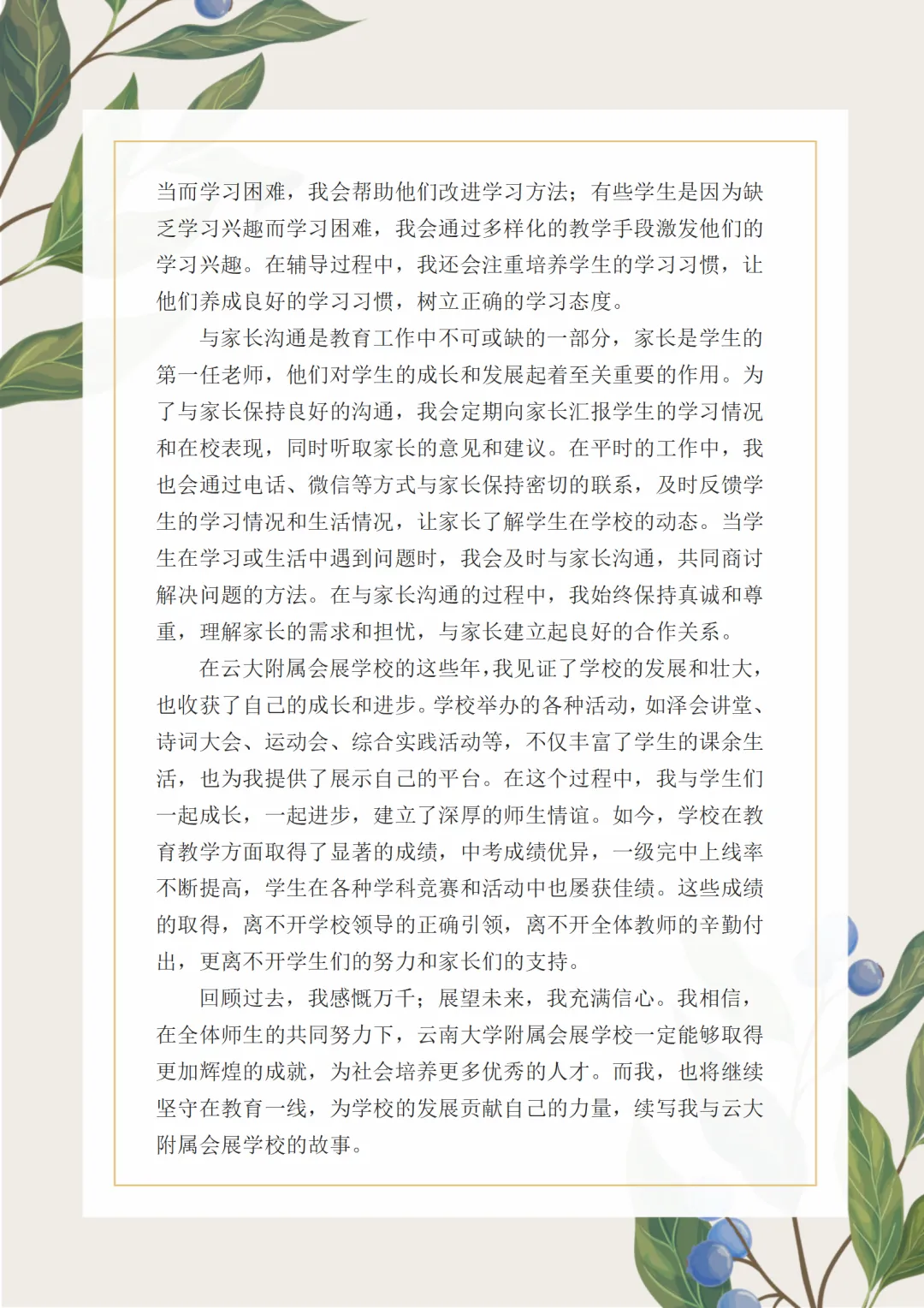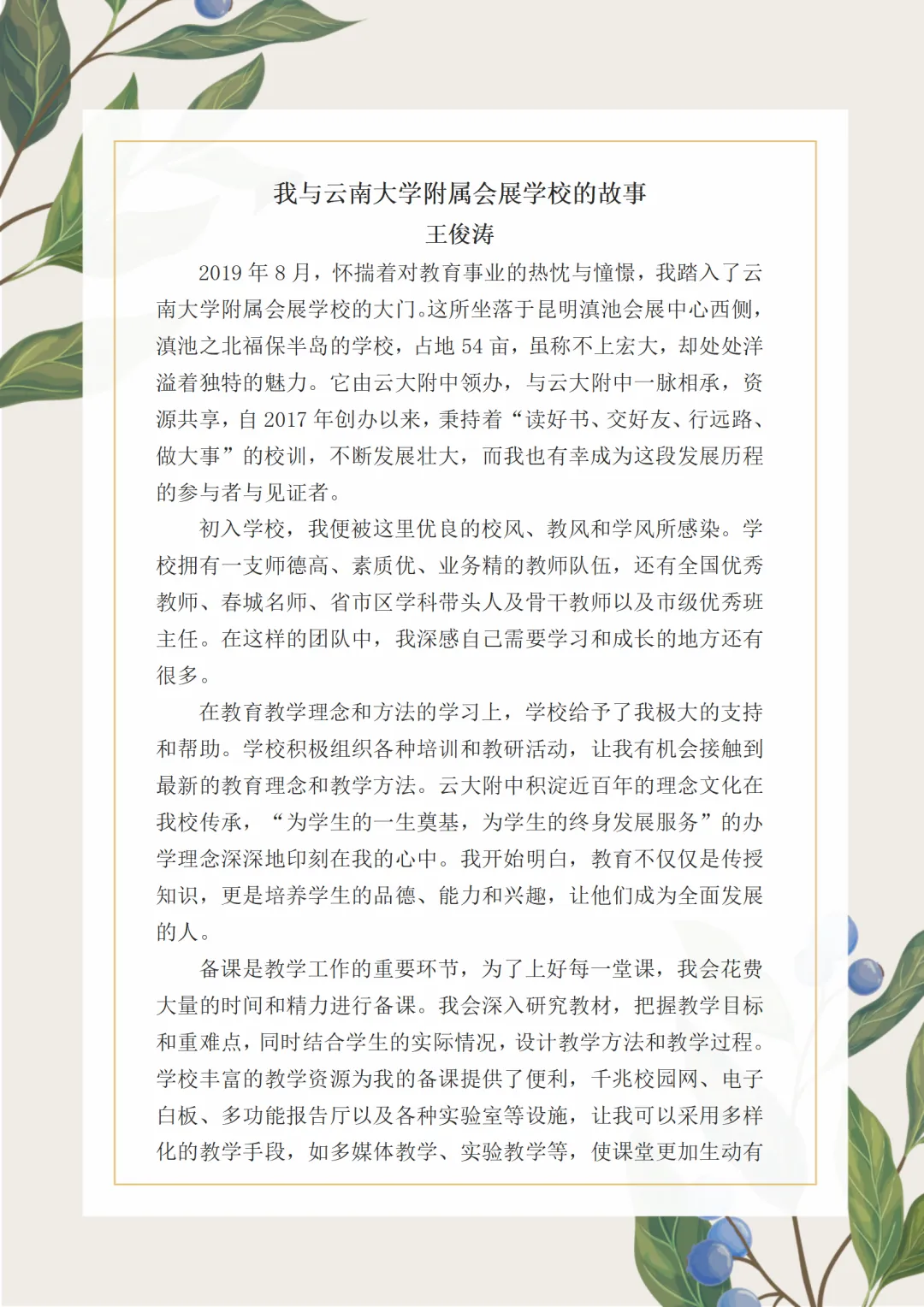 在备课与辅导的日夜里,王俊涛老师初入会展便被优良的校风感染。他花大量时间钻研教材,用多媒体和实验让课堂生动;对成绩稍弱的学生耐心辅导,帮他们找出学习困难的根源。与家长保持真诚沟通,定期反馈学生动态。从泽会讲堂到运动会,他见证了学校中考成绩的攀升,也收获了师生的深厚情谊。他说,教育不只是传授知识,更是培养学生的品德与兴趣——而每一份进步,都藏在那些反复打磨的教案与深夜的辅导里。