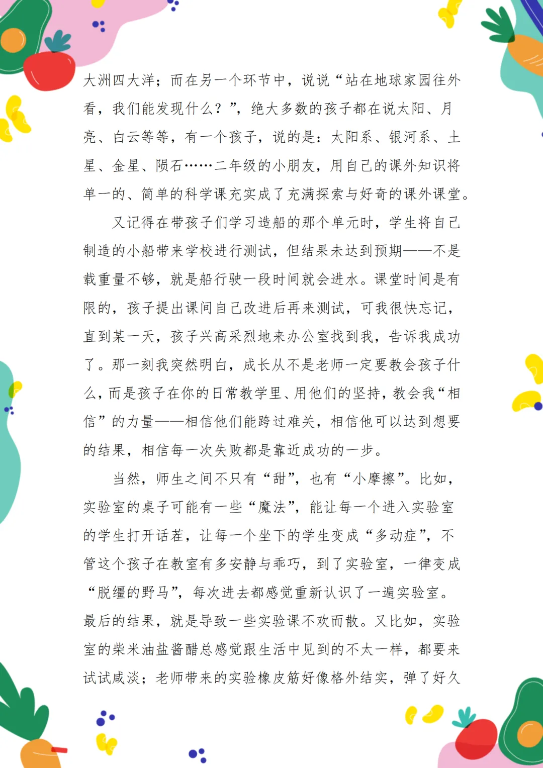 在科学课堂的魔法里,杨彩霞老师最初以为只是知识传递,直到孩子们用天马行空的回答把她“教”会——二年级的孩子画出七大洲四大洋,说出太阳系与陨石。实验室的桌子仿佛有魔力,让安静的孩子变成“脱缰野马”;带来的番茄酱、橡皮筋都成了探险道具。当学生课后默默改进小船直到成功,当毕业生的便利贴写着“愿您以后别再生气”,她忽然明白:科学不止有原理,还有温度。那些一起等待豆芽破土、修理电路的日子,是他们并排走在科学小径上的最好证明。