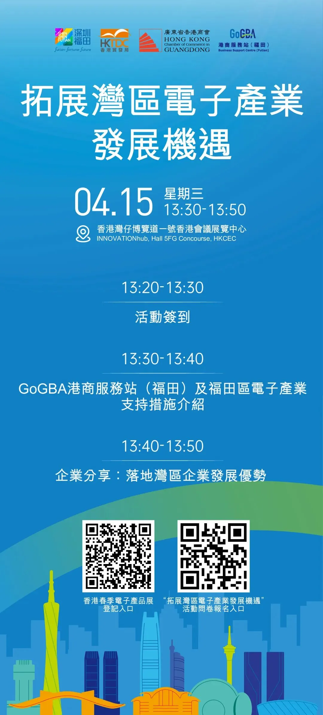 GoGBA港商服务站(福田)将于4月15日(星期三)下午13:30-13:50在香港春季电子产品展举办「拓展湾区电子产业发展机遇」活动,活动现场将进行湾区电子产业支持措施等内容的分享,同时GoGBA港商服务站(福田)也在展会中设置展位,借此机会,加强交流,共拓商机,诚邀港商拨冗出席!(温馨提示,参与活动需依次扫描下方海报的2个二维码进行报名)