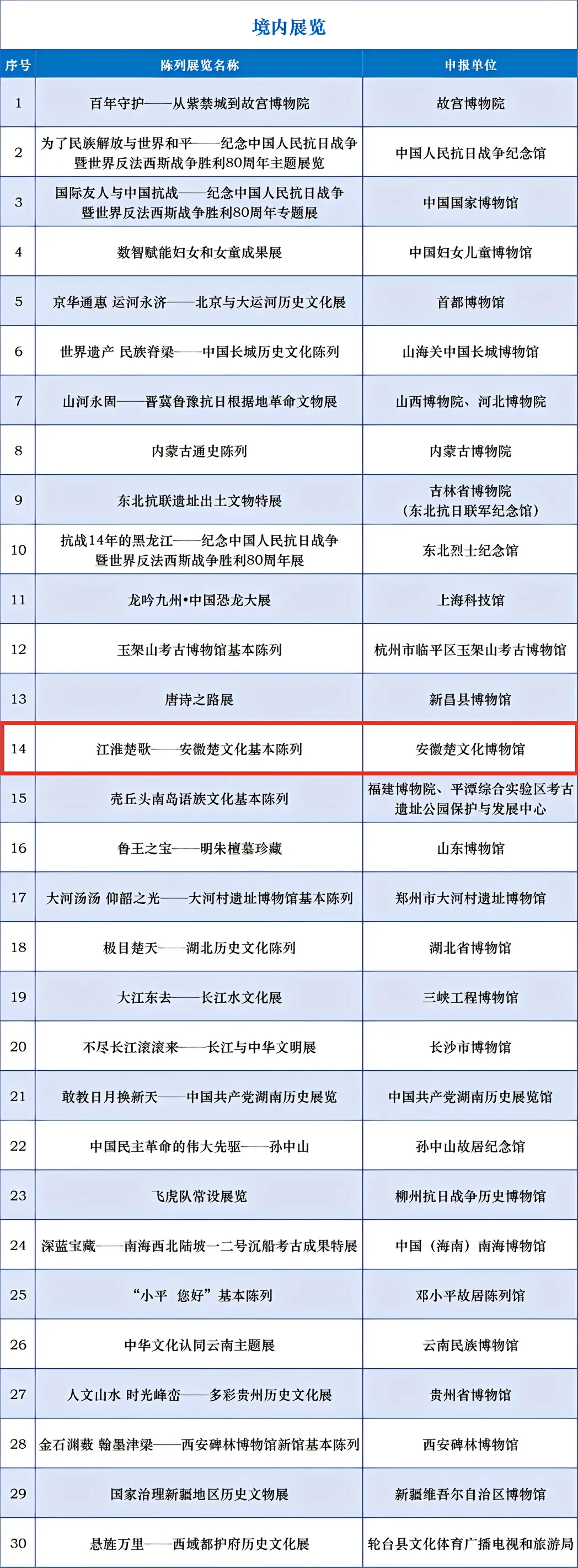 第二十三届(2025年度)全国博物馆十大陈列展览精品推介活动初评会于3月26日至28日在京召开。根据《全国博物馆十大陈列展览精品推介办法》,通过审阅申报材料、观看申报项目视频、讨论交流、实名投票等环节,初评评委会对150项申报项目进行了审核、遴选。经国家文物局核准,共计38项展览入围终评,其中境内展览30项,出境、入境展览各4项。现将入围终评项目向社会公示(名单附后)。