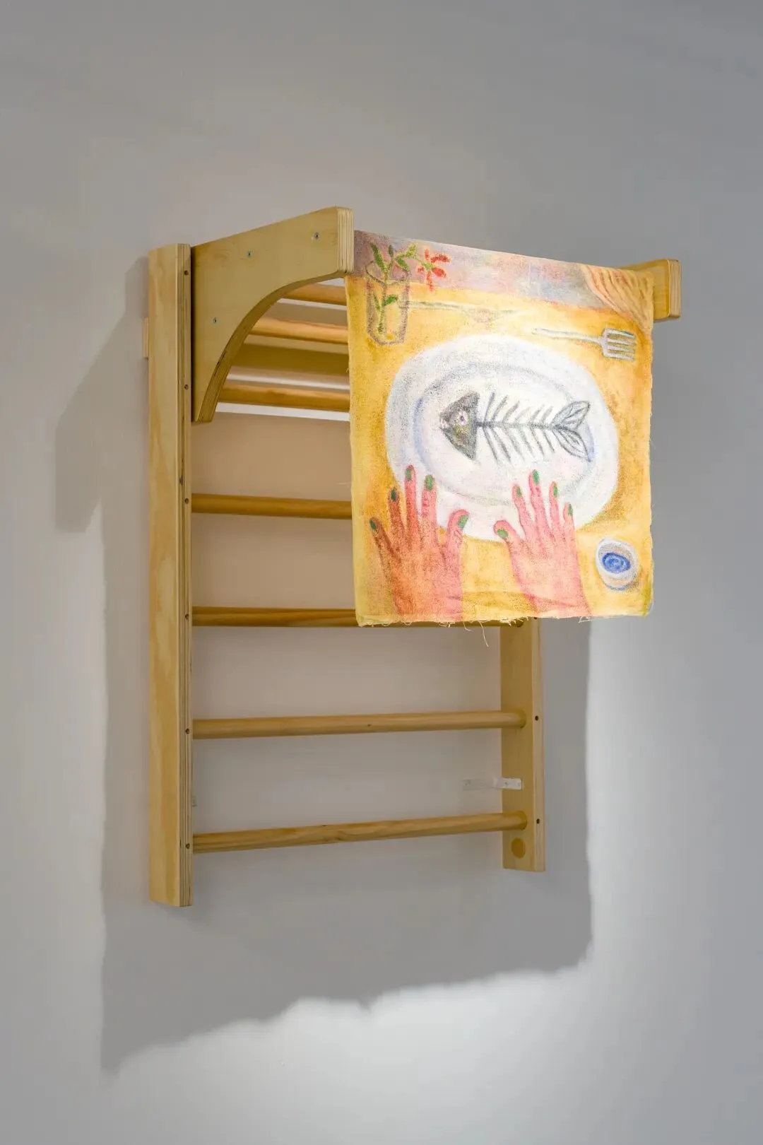 Acrylic on towel, wooden shelf
