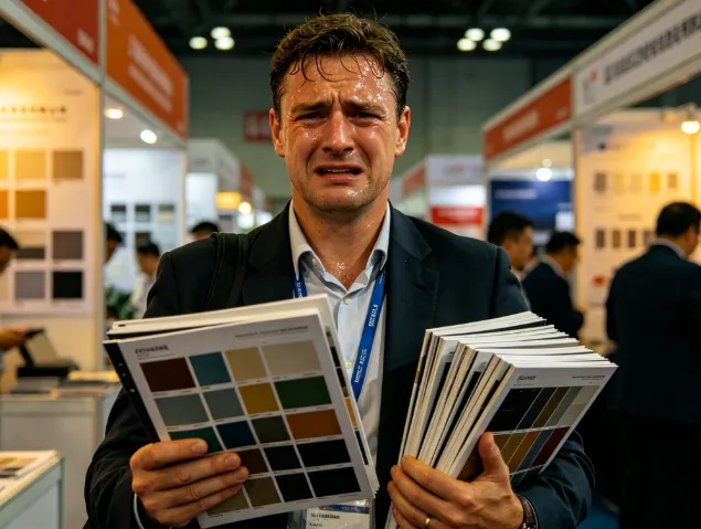 一个拖着大行李箱的德国采购商,手里拎着两个刚买的样品,脖子上挂着蓝色采购商证,走到垃圾桶旁边,面无表情地把一本崭新的、烫金的、足足两公分厚的画册扔了进去。“咣当”一声,特别响。