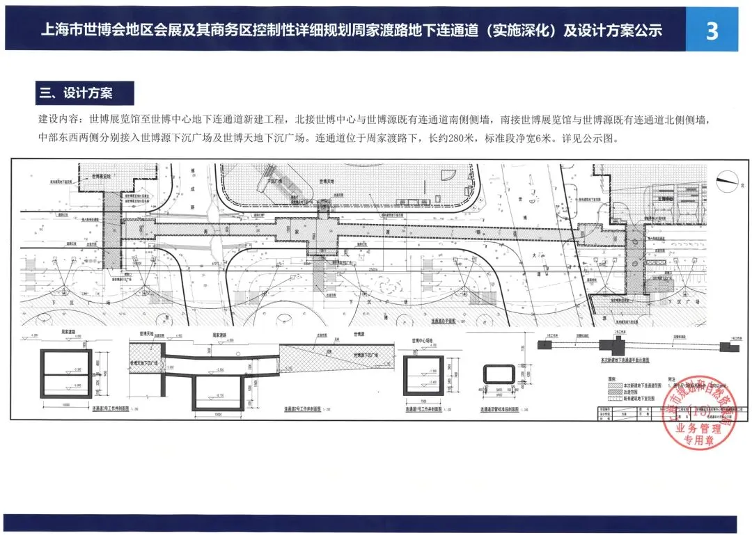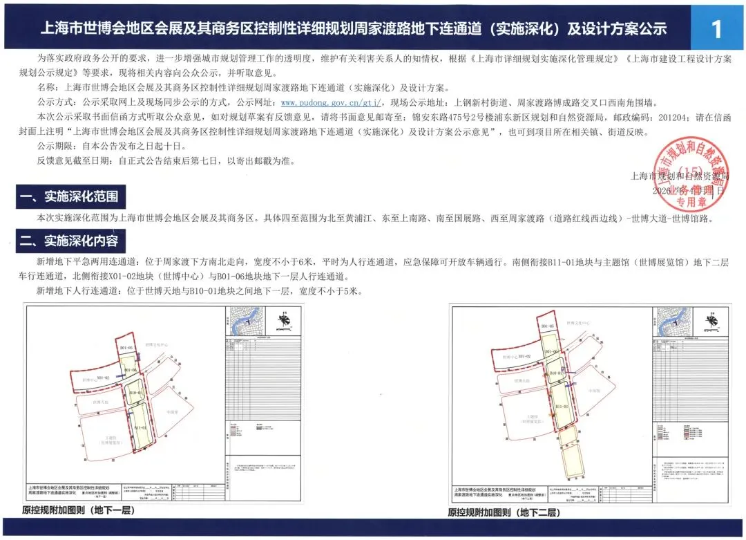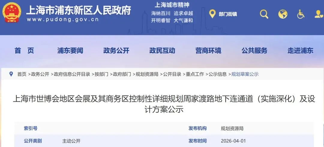 2026年4月1日,浦东新区官网公开《上海市世博会地区会展及其商务区控制性详细规划周家渡路地下连通道(实施深化)及设计方案公示》。