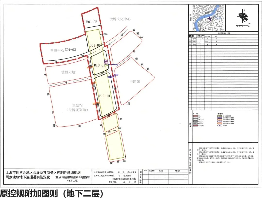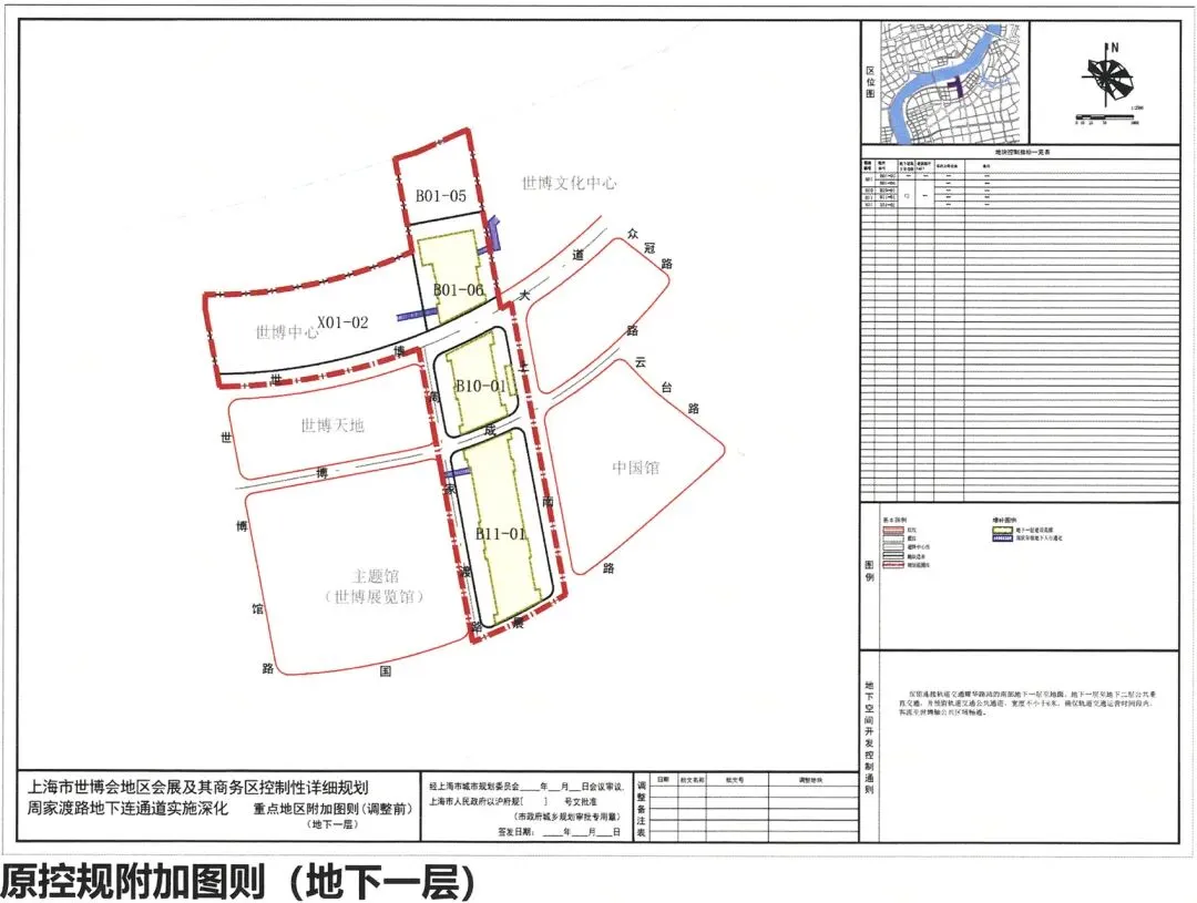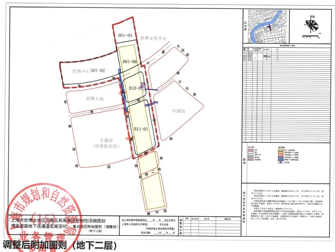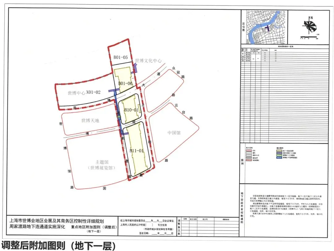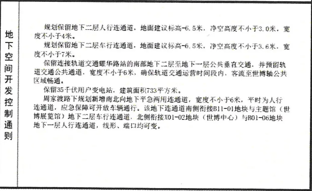 新增地下平急两用连通道:位于周家渡下方南北走向,宽度不小于6米,平时为人行连通道,应急保障可开放车辆通行。南侧衔接B11-01地块与主题馆(世博展览馆)地下二层车行连通道,北侧衔接X01-02地块(世博中心)与B01-06地块地下一层人行连通道。