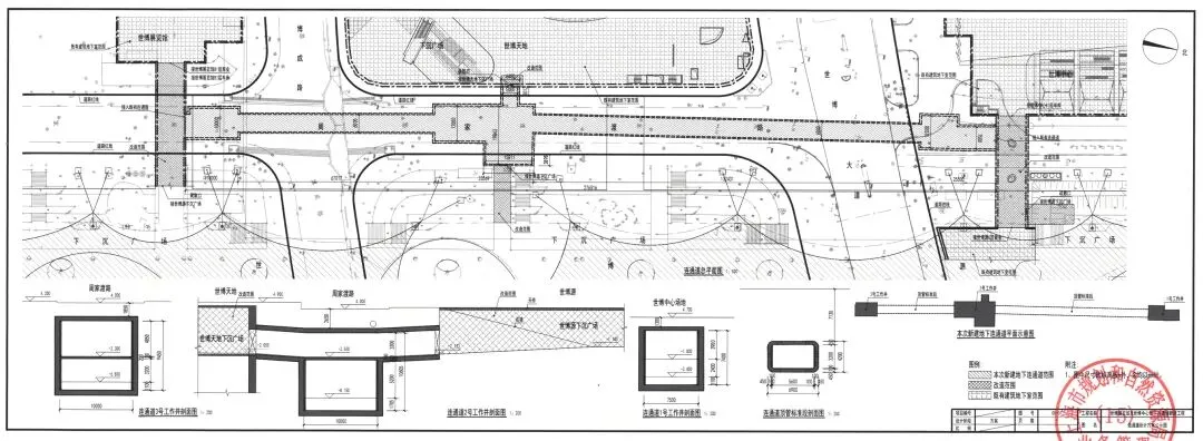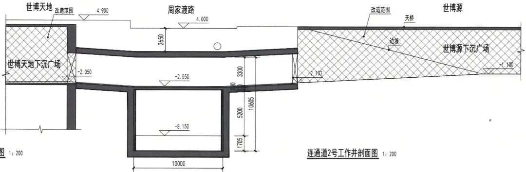 建设内容:世博展览馆至世博中心地下连通道新建工程,北接世博中心与世博源既有连通道南侧侧墻,南接世博展览馆与世博源既有连通道北侧侧墻,中部东西两侧分别接入世博源下沉广场及世博天地下沉广场。