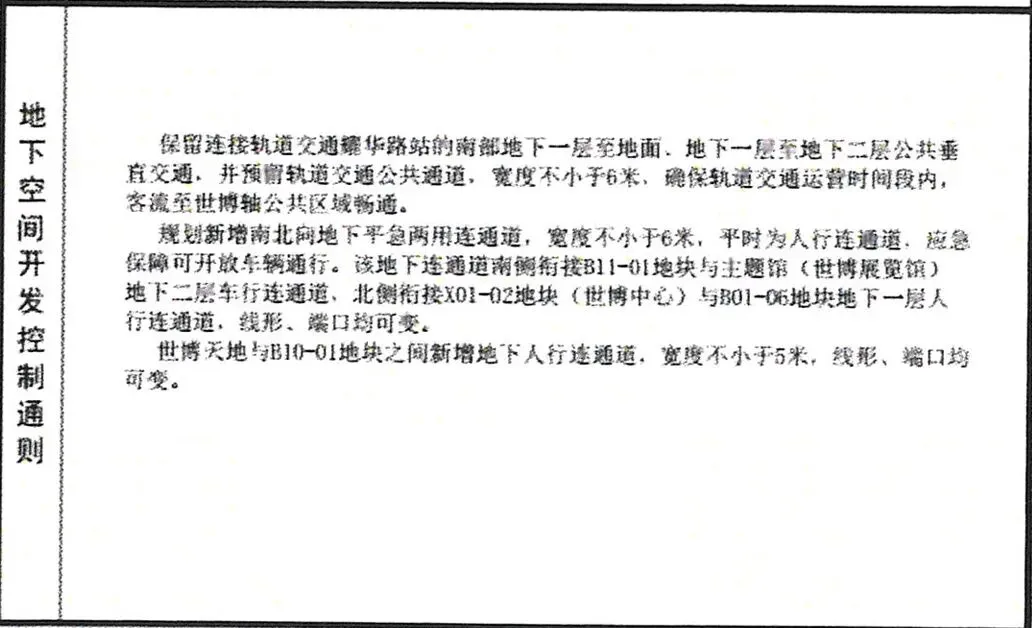 新增地下人行连通道:位于世博天地与B10-01地块之间地下一层,宽度不小于5米。