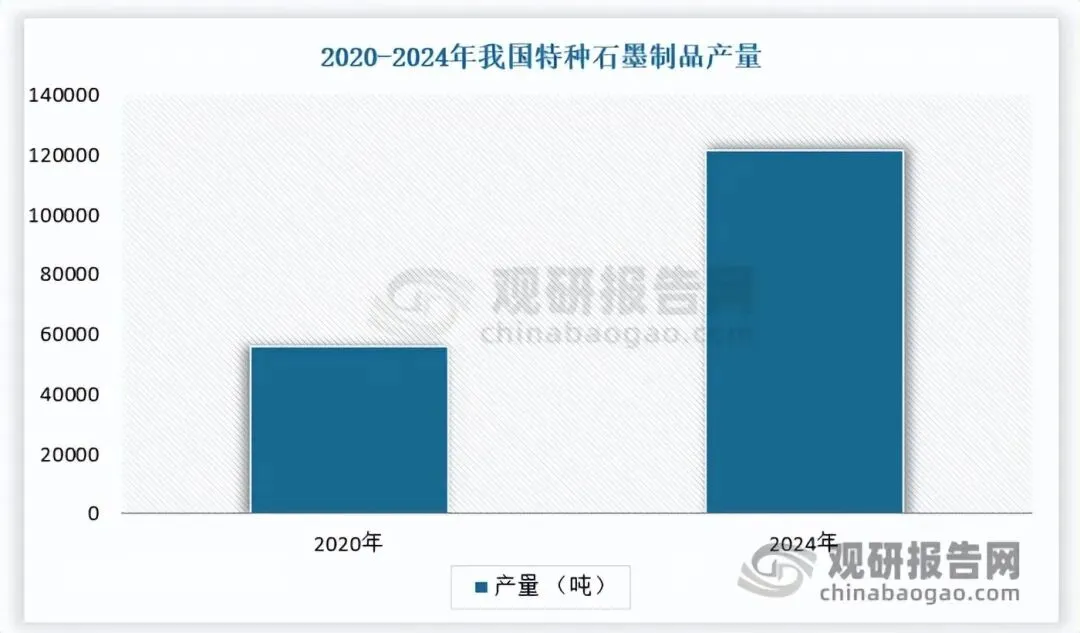 近年来,随着国家对新材料产业的高度重视以及相关政策的支持,我国特种石墨行业实现跨越式发展:企业持续加大研发投入、引进先进装备,并深化与高校、科研机构的产学研合作,突破核心技术壁垒,成功打破国外企业在华垄断。目前,部分国产特种石墨产品的性能与质量已达到国际先进水平,可实现进口替代。数据显示,2020-2024年,我国特种石墨制品产量从55935吨增长至121339吨,年复合增长率达到 21.36%,产量实现快速增长。