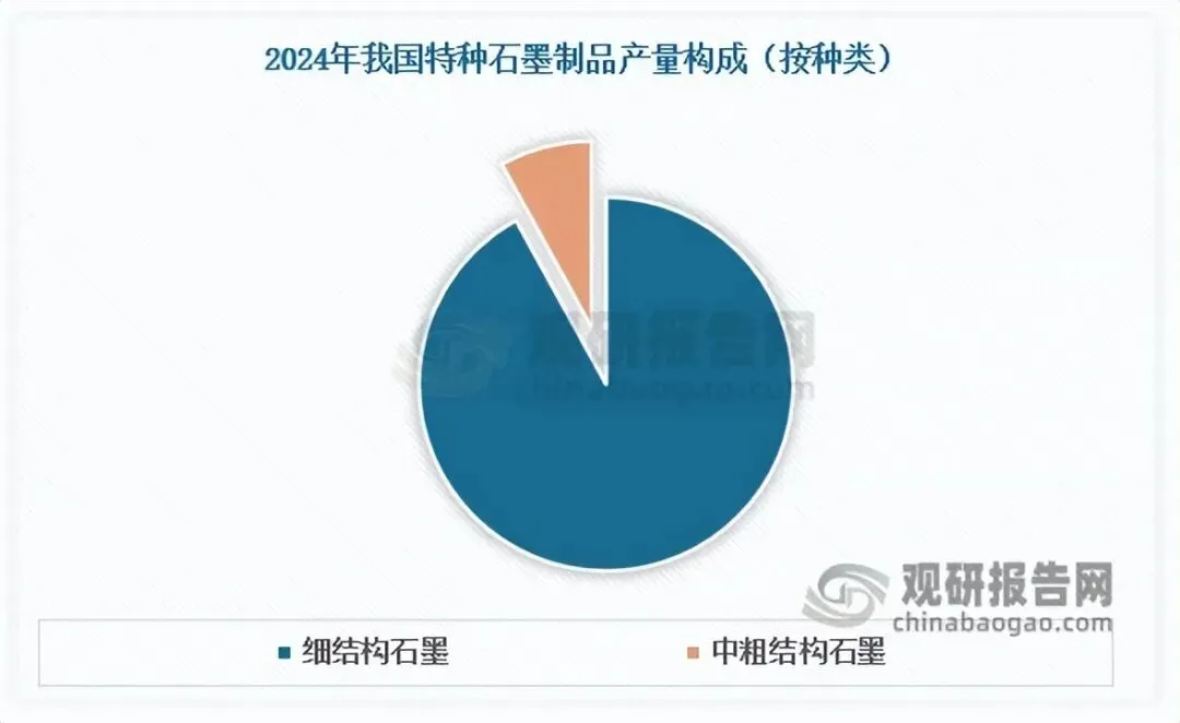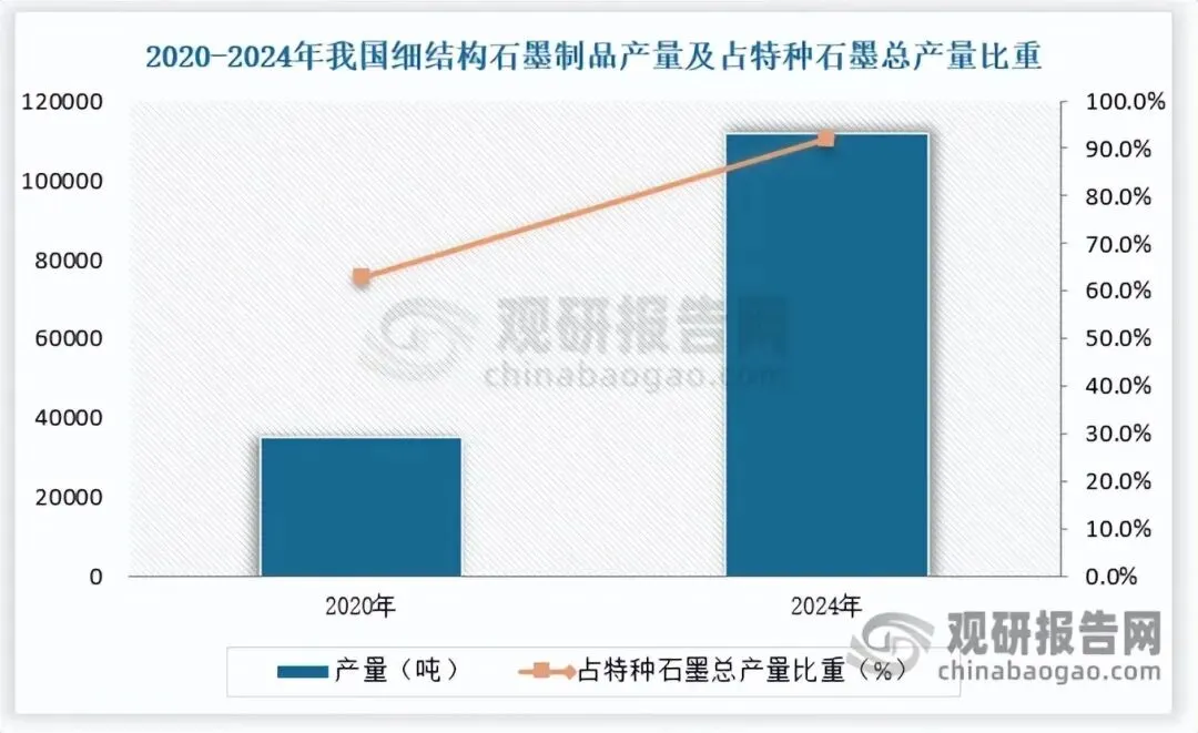 由于具有更优异的纯度、密度与力学性能,细结构石墨能精准适配半导体、光伏、高端装备制造等下游领域的高端需求,使其市场占比持续走高。数据显示,2020-2024年我国细结构石墨制品产量从35058吨增长至111616吨,年复合增长率高达33.58%,占特种石墨总产量的比重也从62.68%跃升至91.99%,成为驱动行业增长的核心引擎。