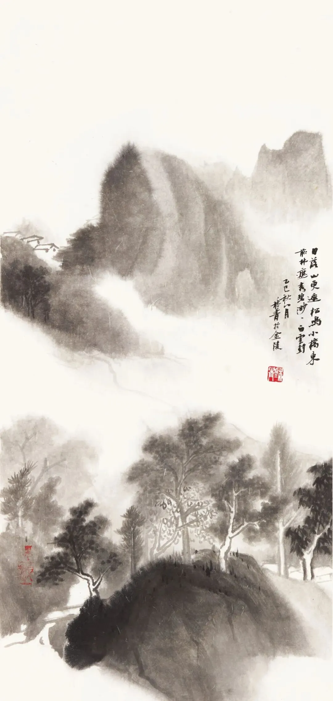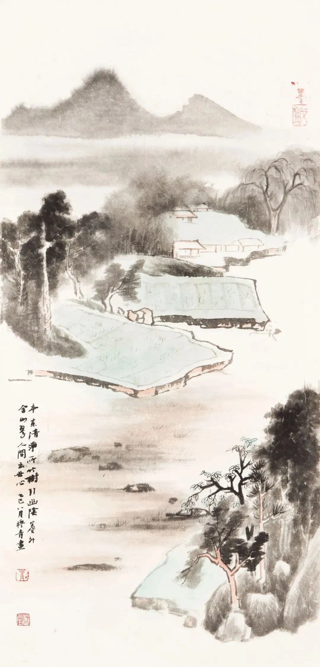 穆青原以书法见长,二十多年前,南京师范大学常国武教授曾称赞其“清雅,不俗;假以时日,定有所成”。后他专攻山水画,心无旁骛,浸淫于传统笔墨与江南烟雨中。他画格清逸隽雅,如清风入怀,似流云在天:水墨山水,淡墨轻岚,疏林远岫间尽得江南温润之气;重彩山水,青绿敷染,丹碧相映,于浓淡相宜中见山河灵秀之姿。他笔下的一松一石、一溪一泉,承载着江南文脉的清雅底蕴,映照着当代文人的艺术情怀。咫尺画幅藏千里之趣,淡墨轻烟蕴万古幽心,让人于驻足凝视间,忘却尘嚣,静赏天地之美,体悟传统之韵。