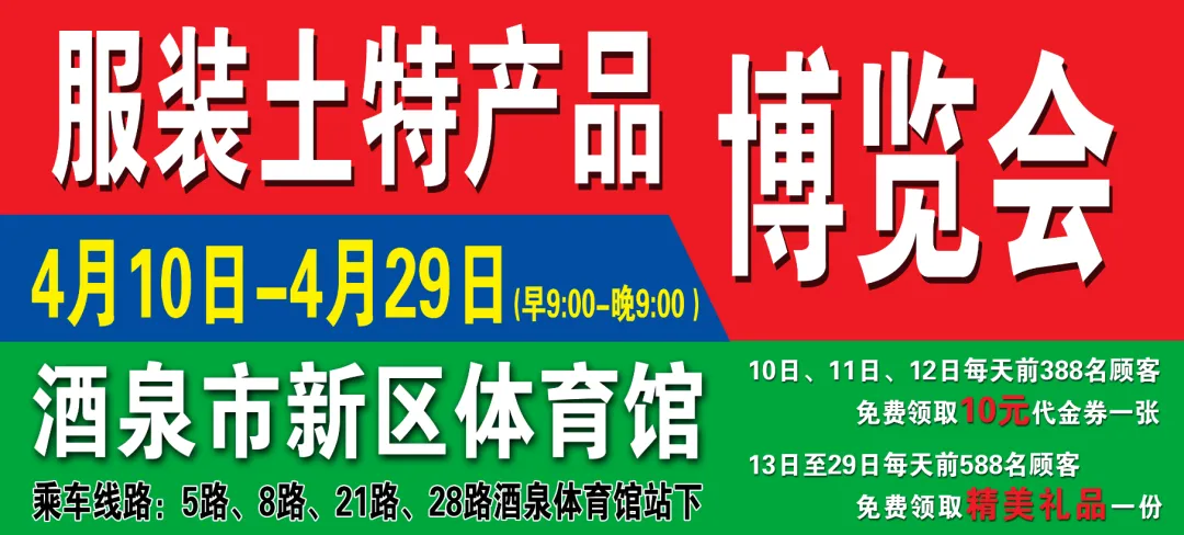 酒泉的家人们注意啦!20天超大型服装土特产品博览会4月10日震撼来袭!地址就在酒泉市新城区体育馆,从4月10日到4月29日,连续20天开放不打烊,吃穿用度一站式购齐,逛到过瘾!