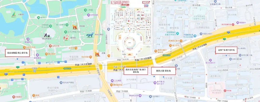 展览馆位于北京西直门繁华商业区,西邻动物园交通枢纽(地铁4号线),东邻西直门地铁站(地铁2/4/13号线)和北京火车站北站,南侧临近地铁车公庄西站(地铁6号线)及金融街与各大部委,北靠中关村科技园区,地理位置十分优越。Q:自驾车如何前往展馆,停车位是否充足,如何收费?A:为了绿色环保、交通顺畅我们强烈建议您搭乘公共交通工具前来观展,不得不驾车的话,小编总结了一下北展附近的停车场。1. 展馆北侧停车场,车位60席,从展馆东侧马路可以进入,12元/小时。2. JK FUN 商城 西外文化休闲广场(北京展览馆对面)也有598个地下停车位(含 8 个快充桩与 6 个慢充桩)可供选择,10元/小时,步行5分钟(约400米)即可到达展会现场。3.华远企业中心停车场:价格: 8元/小时。距离: 步行约10分钟就能到北展剧场或西直门凯德茂,非常方便。 导航直接搜“华远企业中心地下停车场”或“华远企业中心D座”。进停车场后,找外来车辆停放区,停在没挂牌子的普通车位就行。坐电梯(D座1、2单元或A座的电梯都行)上1楼,出来走几步就到北展了。 其他还有北京动物园停车场、金贸中心停车场、阳光大厦停车场等周边商业停车场可供选择。PS:非北京牌照的外地机动车需要办理进京通行证才能在北京全市域内行驶。外省、区、市机动车全天禁止进入二环路(含)以内道路、建国门外大街、复兴门外大街、复兴路(木樨地桥至新兴桥段)。图片来自北京公安交通管理局官网,详情请访问:https://jtgl.beijing.gov.cn/A:设定导航点“北京展览馆”可直达展馆门口,高峰时段拥堵,建议错峰出行。A:共享单车、电动车、摩托车可直接停靠于北展大门两侧步道,无专人看管,请自行停放整齐;购票二维码