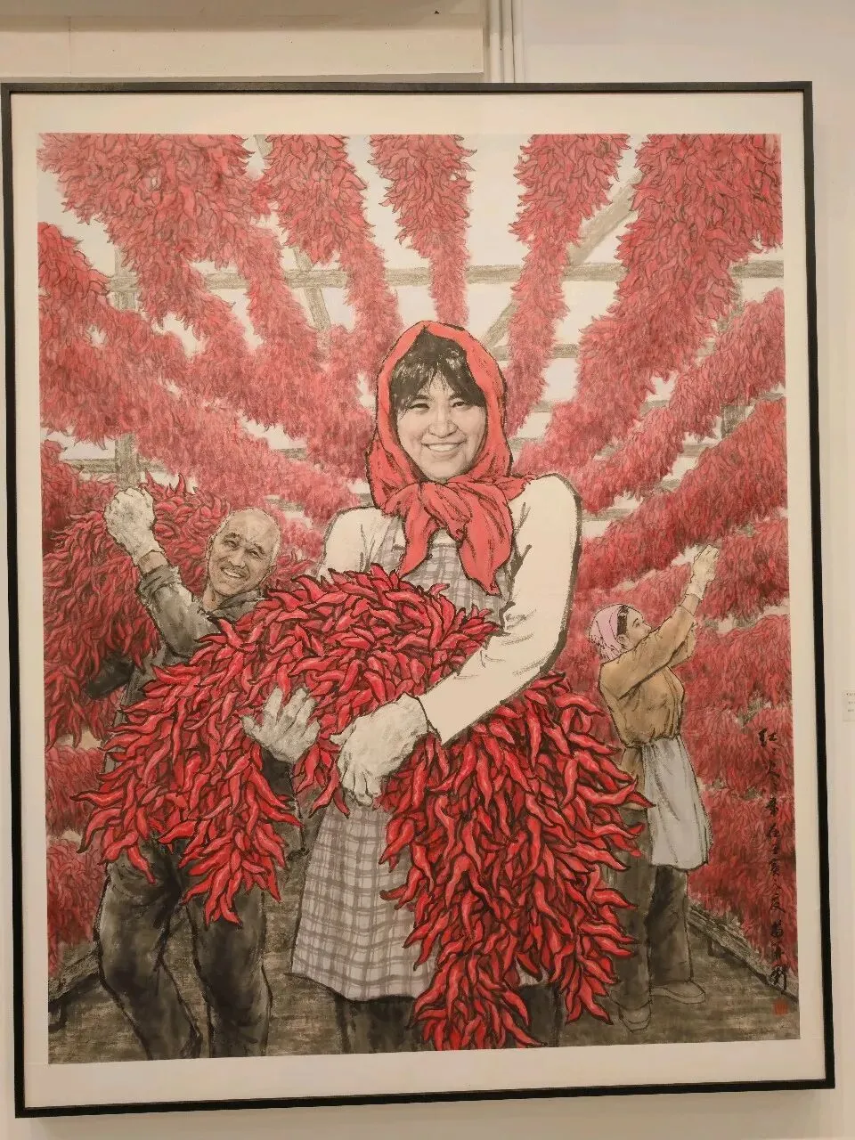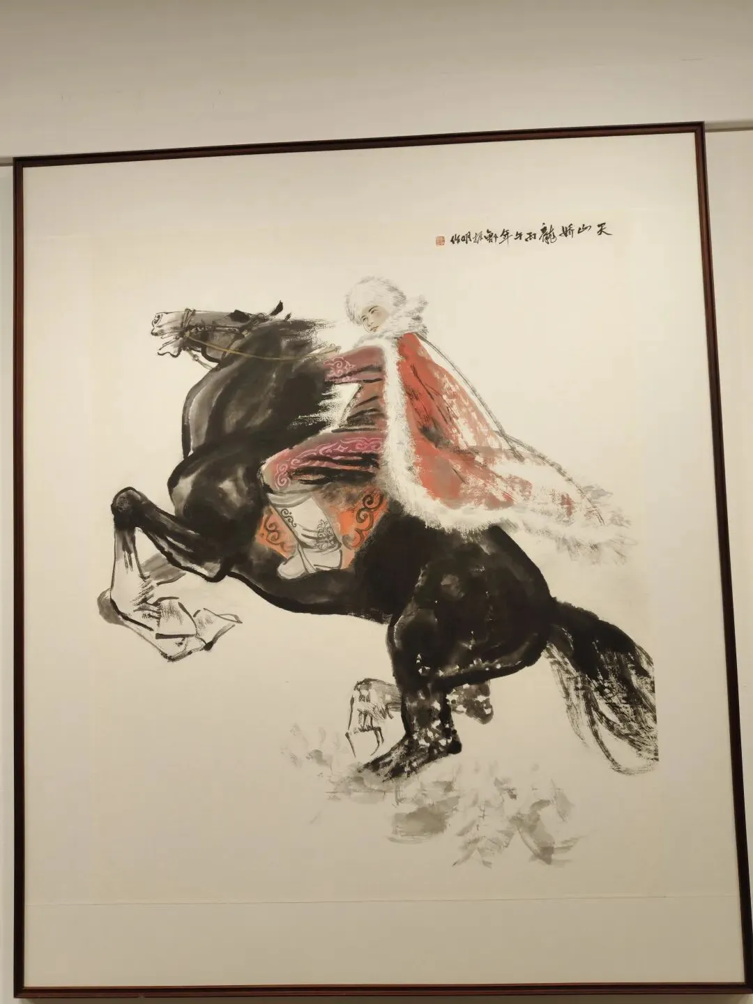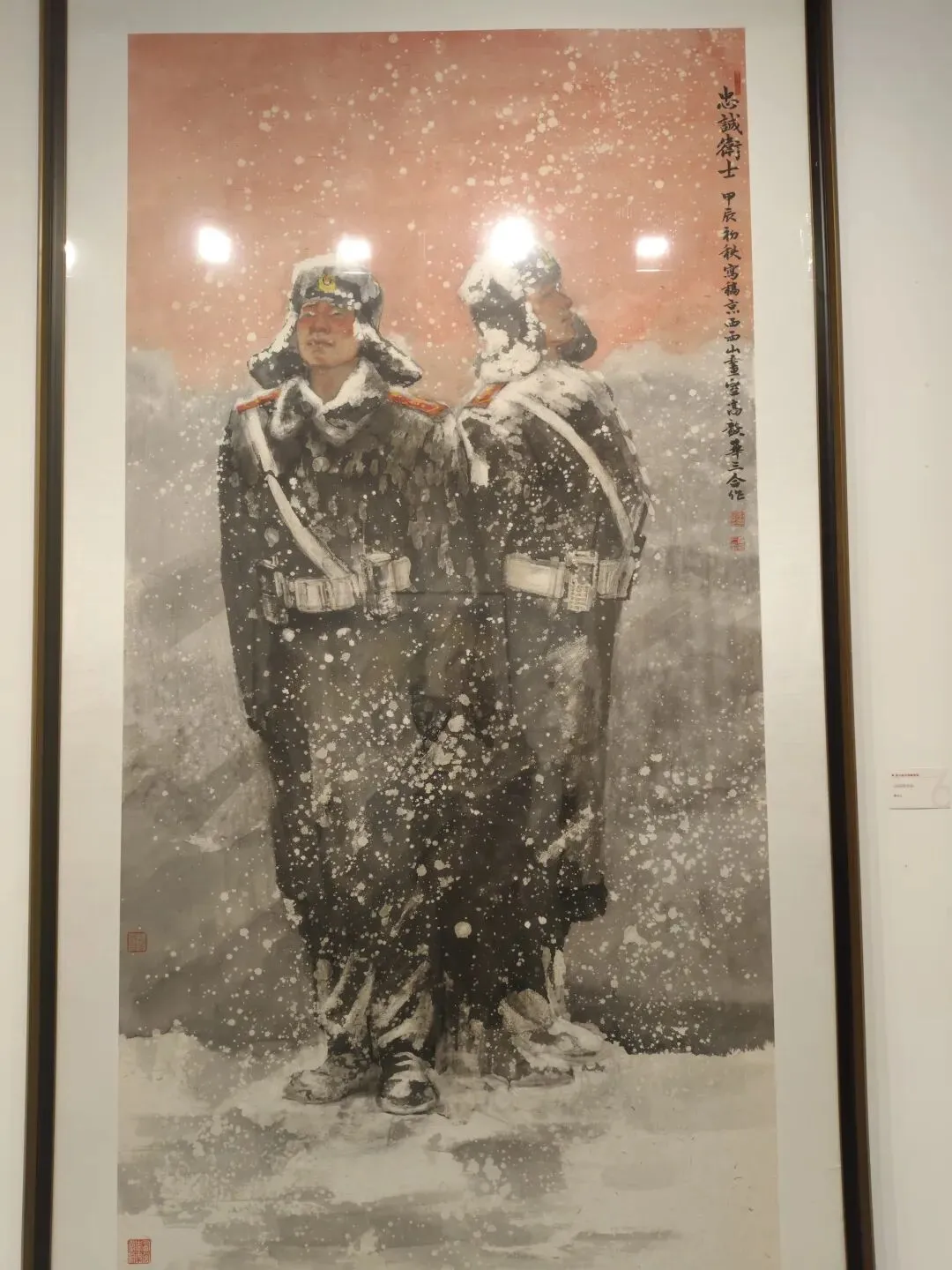 展厅内题材丰富,意趣万千。《天山娇龙》以笔墨叙写新疆旅游局长的动人事迹,风骨凛然;多幅禽鸟与耕牛画作栩栩如生,生机盎然;一幅红辣椒作品饱满鲜亮,满溢丰收之喜。那幅《忠诚卫士》更令人动容:漫天风雪中,两位边防战士背靠背伫立,军大衣落满积雪却身姿如松,目光坚定望向远方。画家以浓墨晕染厚重戎装,以留白衬出落雪质感,暖红天际与皑皑白雪形成强烈对比,将极寒环境下的坚守与忠诚具象化,让观者读懂了“岁月静好”背后的负重前行。另一幅日照金山图则尽显山河壮阔:主峰金顶在朝阳下熠熠生辉,群峰簇拥、云海翻涌,藏式民居掩映于林海之间,传统山水的笔墨意趣与写实光影完美融合,绘就出雪域高原的圣洁与壮美。