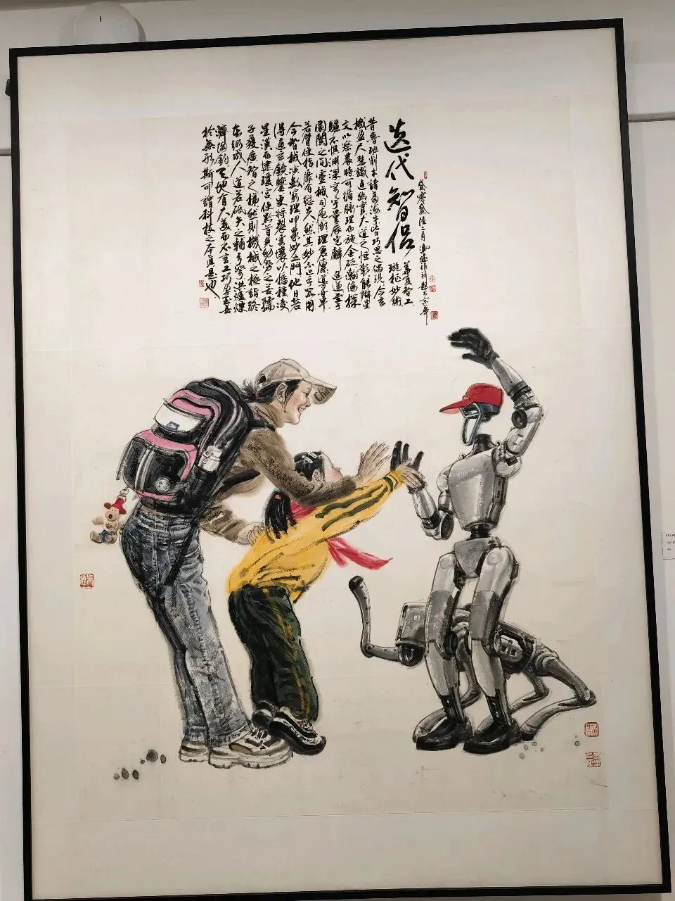 展厅之中,冯远的《迭代智侣》尤为动人。画面里一对母女与机器人温情互动,机器人俯身与孩童击掌,母亲在旁含笑呼应,AI时代的科技感与人间暖意浑然一体。画作既有扎实严谨的造型功底,又不失水墨的灵动气韵,传统水墨与现代科技碰撞出独特火花,尽显当代国画与时俱进的生命力。