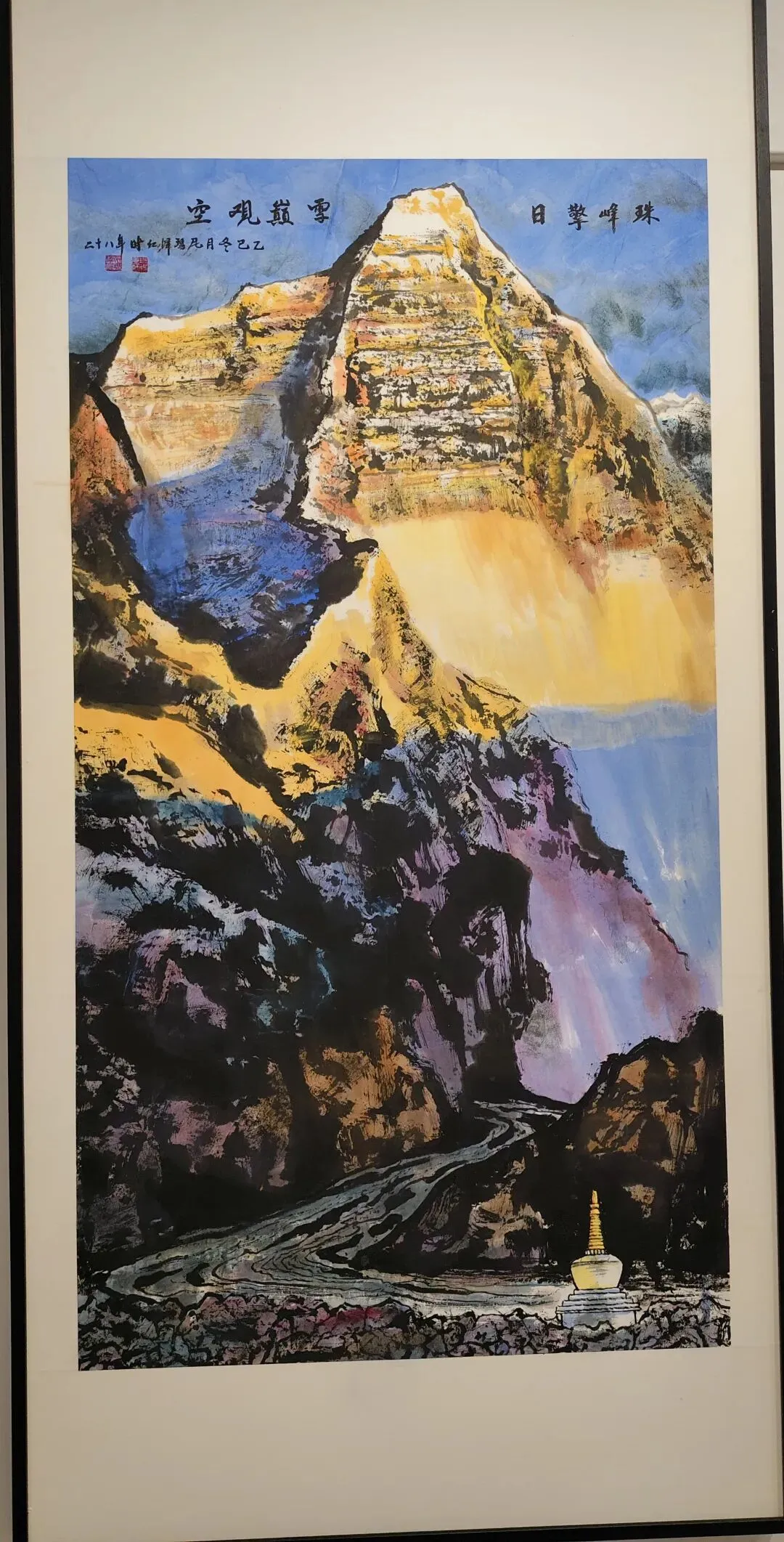 尼玛泽仁的《珠峰擎日·雪巅观空》同样震撼人心,画作以金黄、宝蓝等明艳色彩铺陈,将珠穆朗玛峰的雄浑壮阔绘写得淋漓尽致,磅礴气势扑面而来,予人昂扬向上的力量。