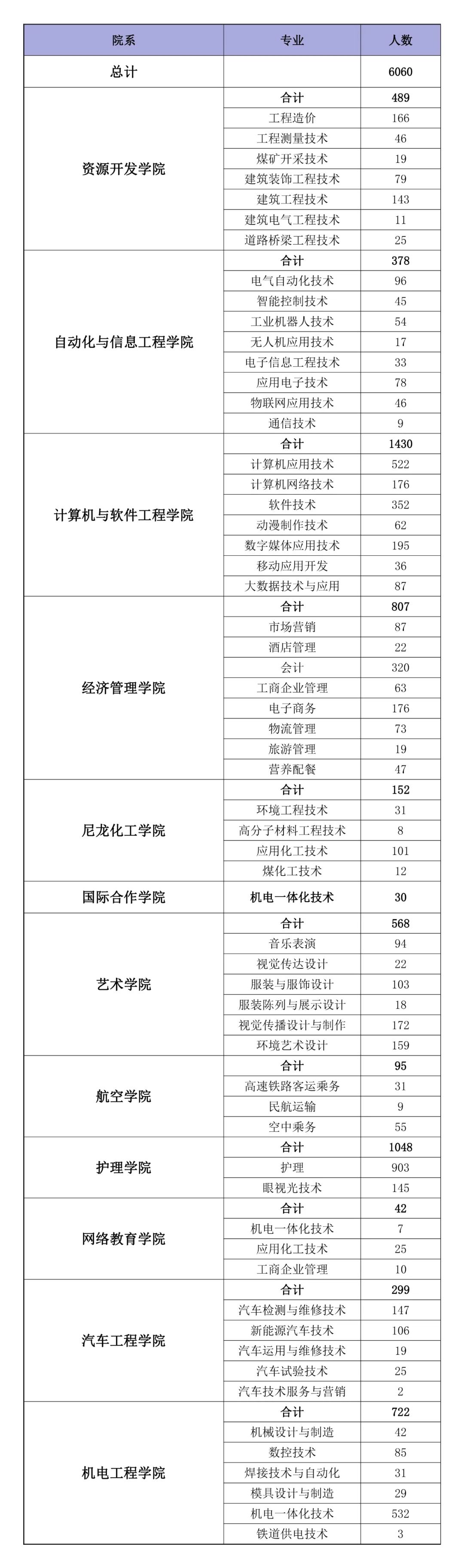 学校现开设专业60余个,其中,国家级重点建设专业6个,省级高水平专业群1个,省级教学改革试点专业7个,省级特色专业建设点5个,全日制本科、高职在校生近2万人。