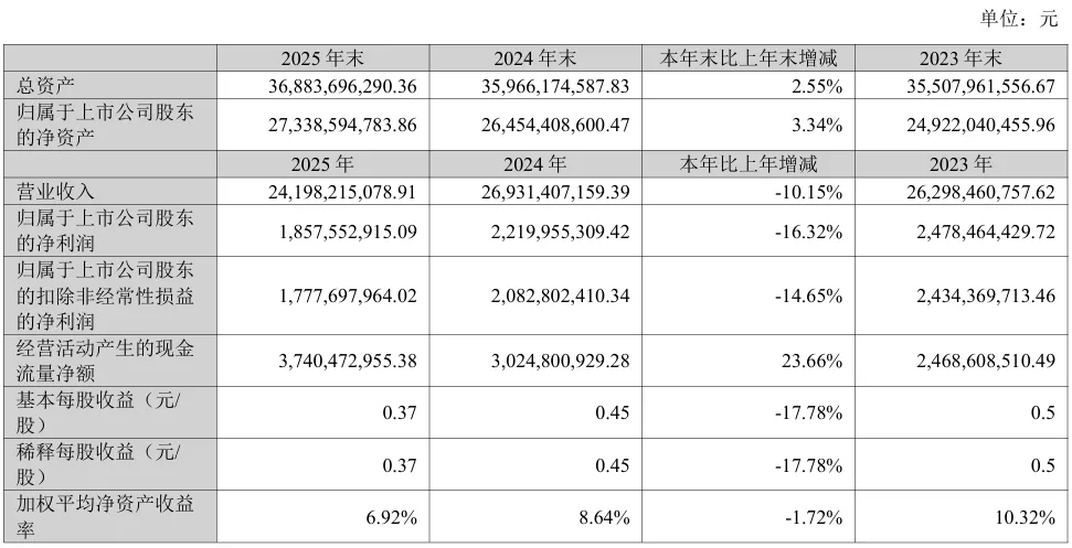 发布2025年年度报告,交出行业寒冬下的稳健答卷。报告显示,公司全年实现营业收入241.98亿元,归母净利润18.58亿元。经营活 动现金流净额达37.40亿元,同比大增23.66%,成为财报亮点。