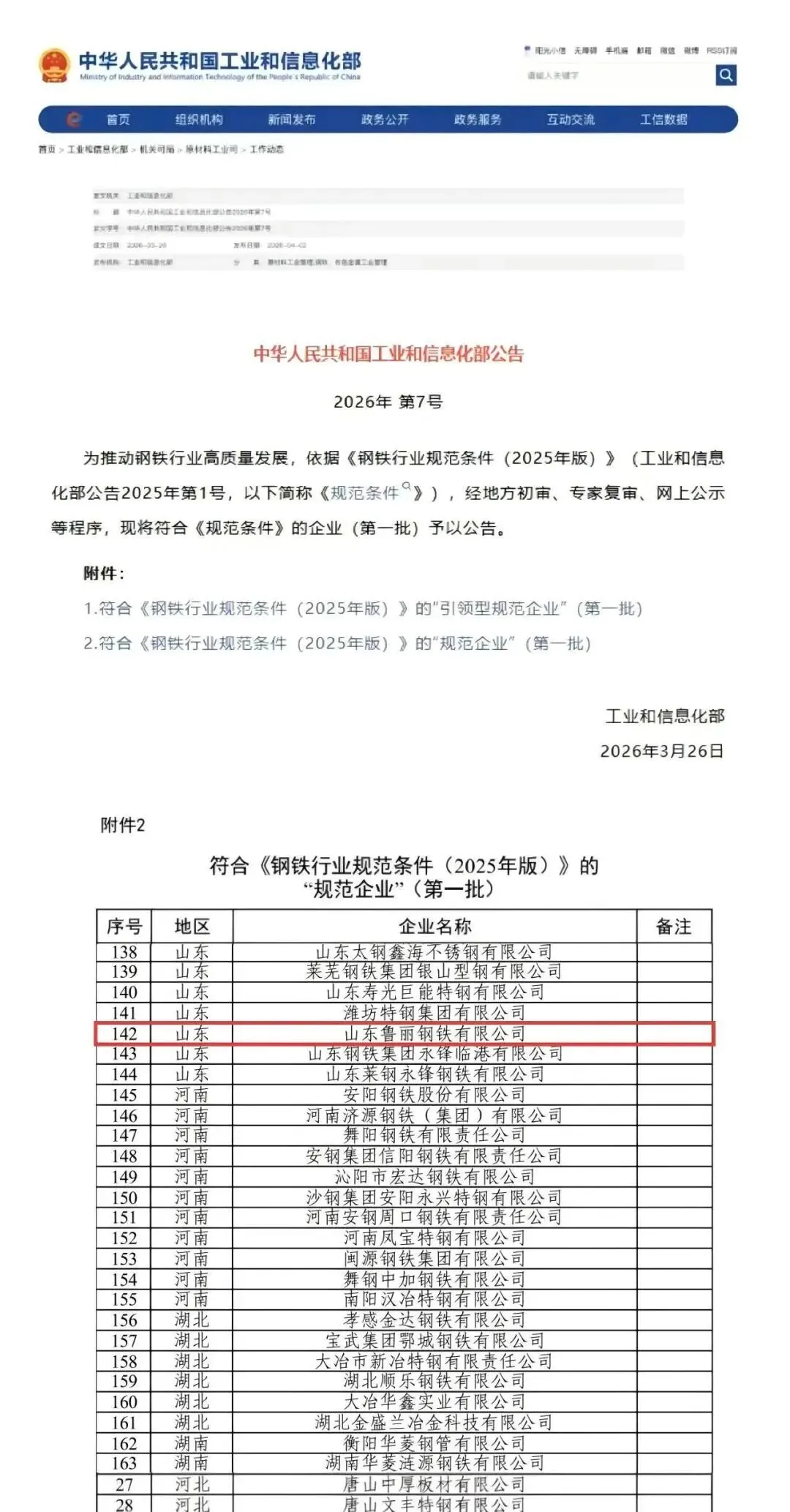 近日,工业和信息化部正式公告符合《钢铁行业规范条件(2025 年版)》的 “规范企业”(第一批)名单,山东鲁丽钢铁有限公司凭借在绿色低碳、高端制造、技术创新等领域的卓越表现成功入选,标志着公司在钢铁行业高质量发展道路上迈上新的里程碑,更获得了国家权威部门的高度认可与肯定,彰显了企业在行业内的领先地位。