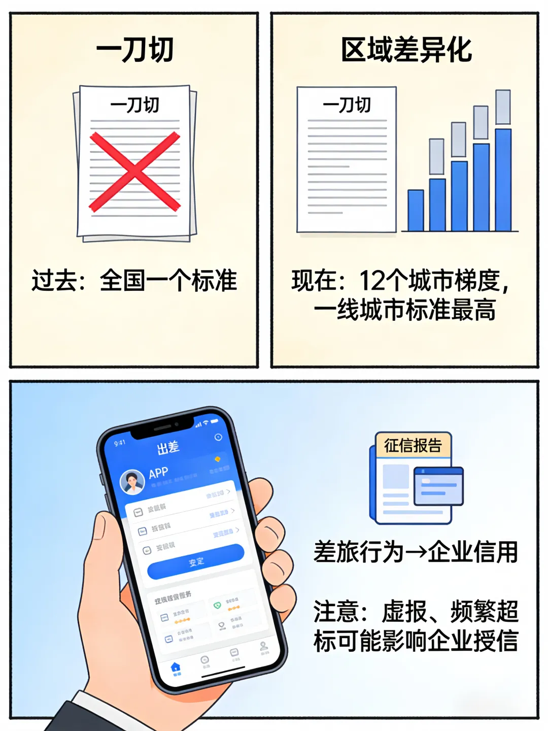 1.1 财政部《中央企业差旅费管理办法》修订(2026 年 1 月生效)核心调整:• 区域差异化动态调整:不再"一刀切",根据城市经济发展水平、物价指数浮动调整住宿与伙食补贴上限。一线城市(北上广深)住宿标准普遍高于三四线城市。• 补贴与征信挂钩:部分大型平台已试点将员工差旅行为纳入企业信用评估体系,虚报、频繁超标可能影响企业授信。• 分级管控加强:跨省、跨区域出差需明确事由,行程需与审批一致,否则可能被认定为"无实质内容差旅",面临审计风险。
