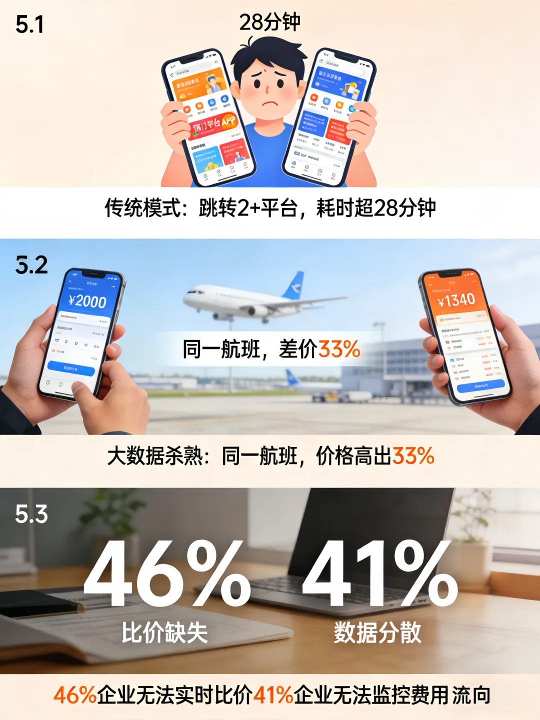 2.3 行业痛点• 46% 的企业因同屏实时比价缺失导致无法即时选择性价比最优的产品• 41% 的企业因消费数据分散在各服务商平台,无法实时监控费用流向• 传统模式下员工需跳转 2 个以上平台完成差旅预订,耗时超28 分钟• 部分企业采用单一差旅服务商模式引发大数据杀熟问题,同一航班价格比外部渠道高出 33%