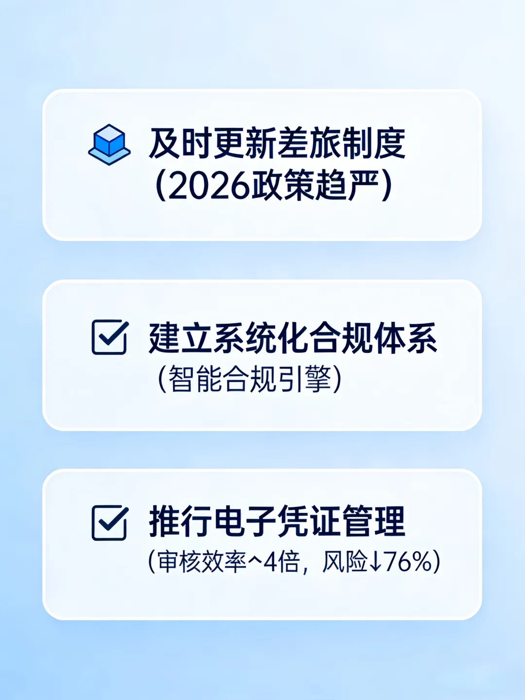 4.1 对企业差旅管理的建议• 及时更新差旅制度:2026 年政策趋严,企业不能再沿用几年前的老标准• 建立系统化合规体系:采用智能合规引擎,自动匹配最新差旅标准库• 推行电子凭证管理:财务审核效率可提升 4 倍,合规风险下降76%