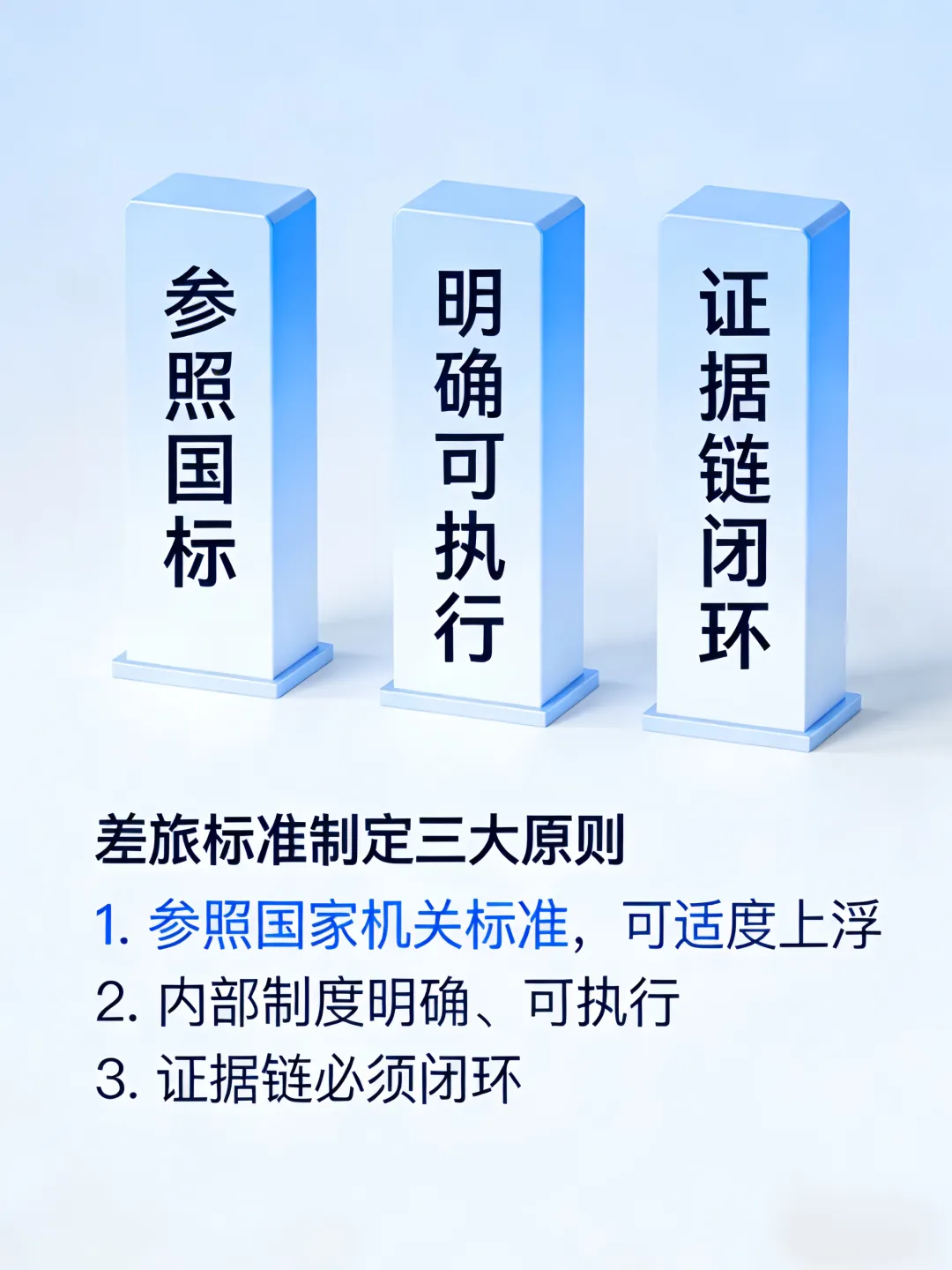 4.2 差旅标准制定三大原则• 参照国家机关标准,但可适度上浮(企业标准可以比公务员高,但不能离谱)• 内部制度要明确、可执行(不同职级标准、超标处理、津贴规则等)• 证据链必须闭环(出差申请→审批→票据→报销单→入账,每一步都要有记录)