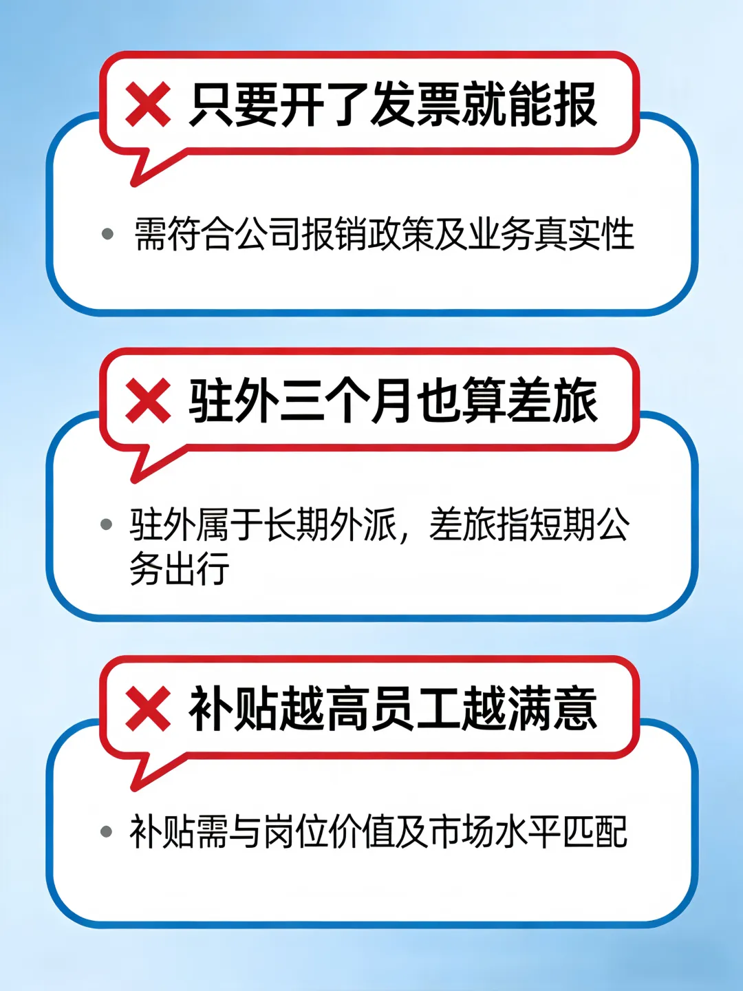 4.3 常见误区提醒• ❌ "只要开了发票就能报" → 错!超标、无审批、事由不清照样被退• ❌ "驻外三个月也算差旅" → 错!长期外派属于"驻外补助",需并入工资计个税• ❌ "补贴越高员工越满意" → 风险高!不合理补贴可能被税务认定为薪酬,补税 + 罚款