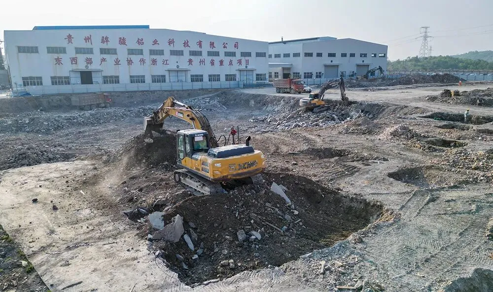 在贵州骅骏铝业科技有限公司铜铝共晶板带材智能生产线建设项目现场,挖掘机、运输车来回穿梭,工人正有条不紊地进行厂房基坑开挖工作,一片火热景象。