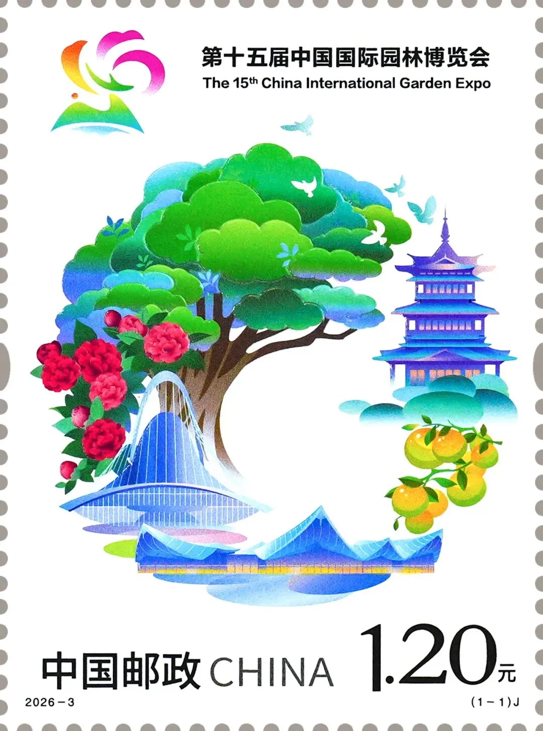 中国邮政定于2026年4月15日发行2026-3《第十五届中国国际园林博览会》纪念邮票一套1枚。本套邮票由王子源、夏竞秋设计,北京邮票厂有限公司胶版印制,计划发行420万套。