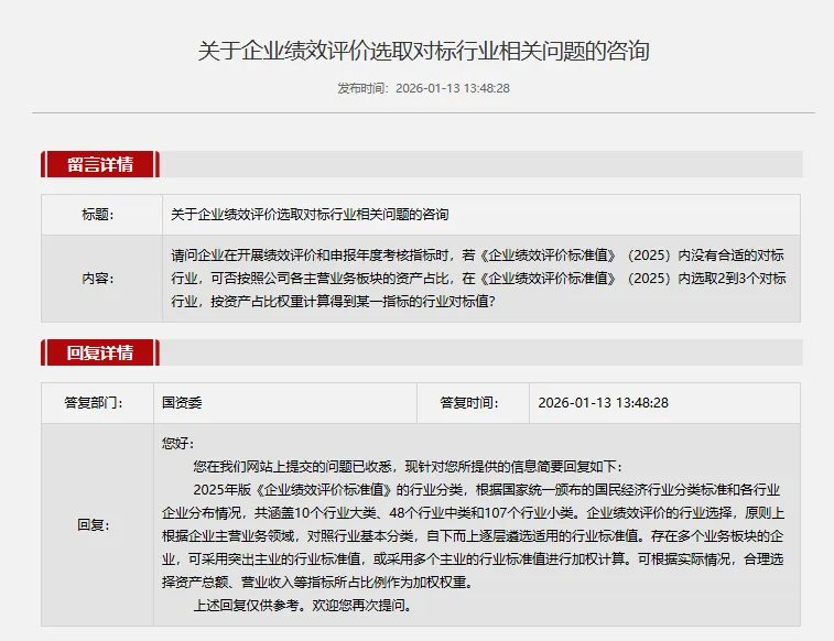 问:请问企业在开展绩效评价和申报年度考核指标时,若《企业绩效评价标准值》(2025)内没有合适的对标行业,可否按照公司各主营业务板块的资产占比,在《企业绩效评价标准值》(2025)内选取2到3个对标行业,按资产占比权重计算得到某一指标的行业对标值?