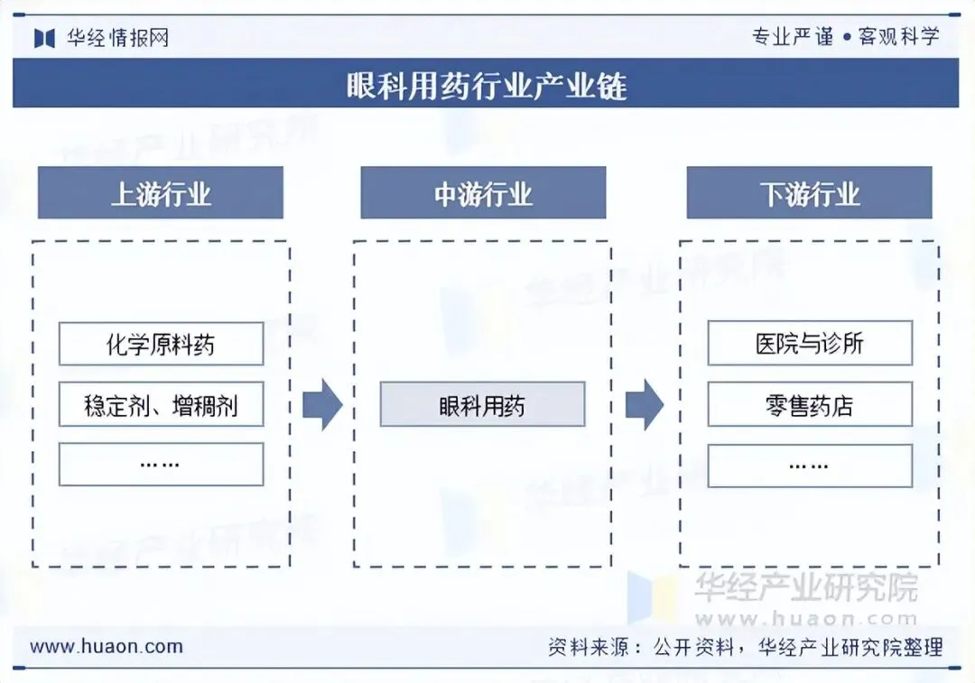 产业链方面,上游为原材料供应环节,涉及化学原料药、生物活性原料、辅料(溶剂、稳定剂、增稠剂等)、包装材料(药瓶、滴管、标签等)等;中游为眼科用药研发与制造环节,涵盖了药物剂型开发、生产工艺优、临床实验及检测等流程;下游则是销售环节,主要包括医药与诊所、零售药店、互联网医药电商等渠道。