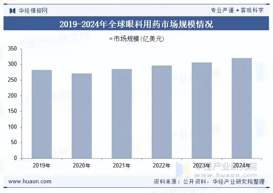 整体而言,全球眼病患者基数持续扩大,随着人口老龄化进程加快,年龄相关性黄斑变性、白内障、青光眼等老年性眼病患者数量大幅增加,并且,电子设备的普及让全球干眼症、视疲劳等眼病呈现年轻化趋势,叠加糖尿病等慢性病引发的视网膜病变等并发症增多,共同催生了庞大的眼科用药需求。2024年,全球眼科用药市场规模约为321.3亿美元。
