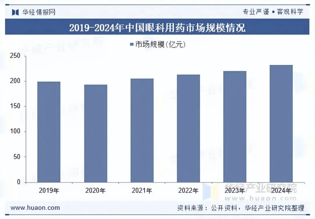 数字化时代下,电子屏幕使用时长激增,生活方式催生常见眼病高发,致使干眼症患病率上涨,青少年近视率也居高不下,从而让人工泪液、近视防控相关药物等需求快速增长。同时,我国居民居民眼健康关注度不断提高,不再局限于疾病治疗,对眼部预防保健类用药、术后康复用药的需求也持续增加,进一步拓宽了眼科用药的市场空间。2024年,中国眼科用药市场规模约为232.6亿元。