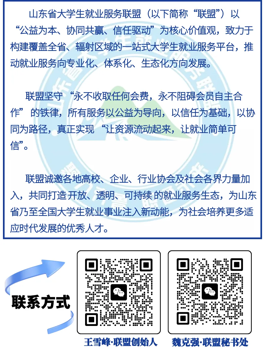 聚力齐鲁,职通未来。山东省大学生就业服务联盟期待与您携手,共同为山东学子和高质量就业贡献力量。共创千亿蓝海!