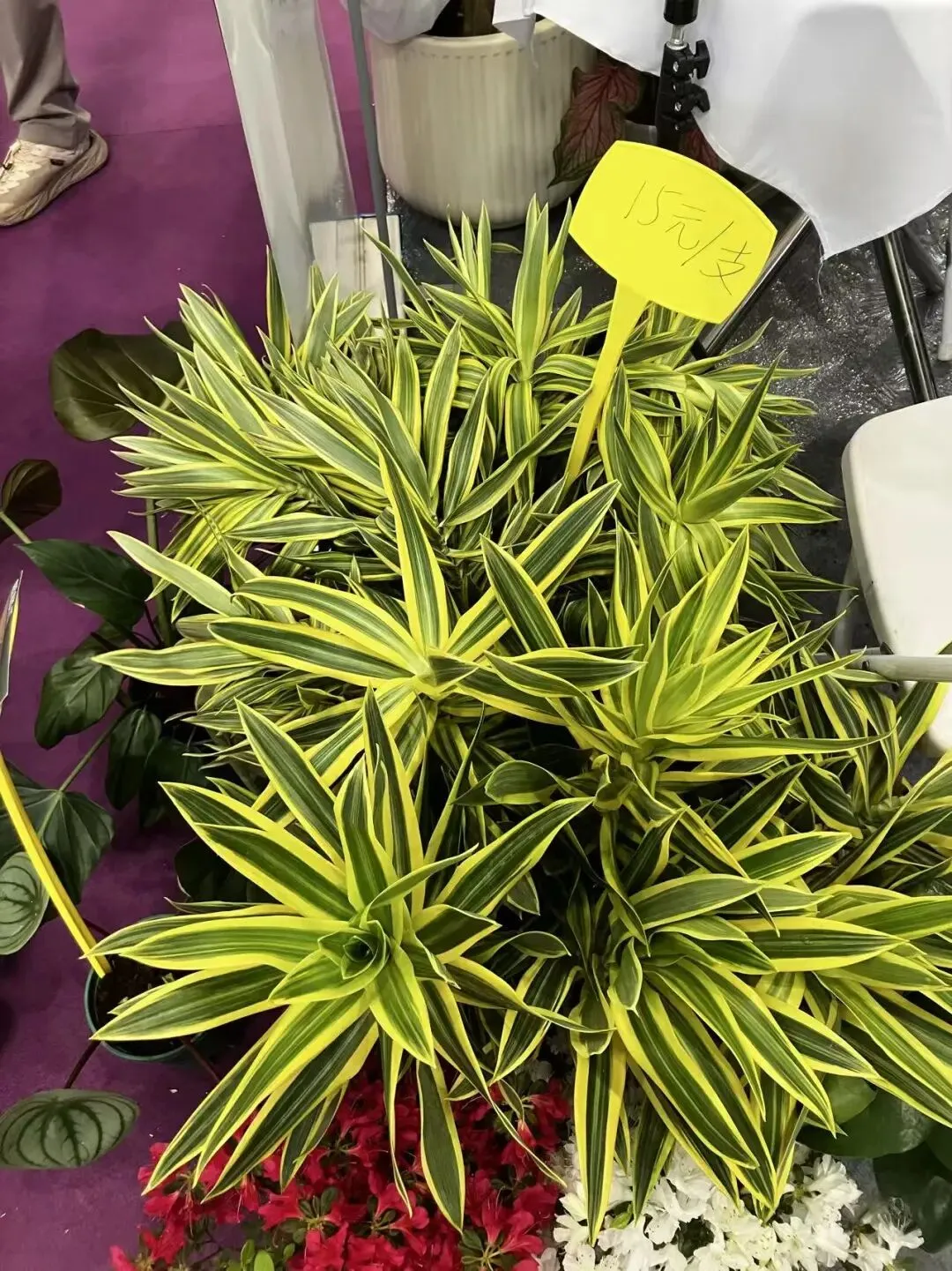 在传统的印象中,百合竹多以叶面带有黄色条纹或边缘金黄的形态示人,且老款品种的叶片常常呈现出较为明显的卷曲状态。然而,此次展出的新品黄金百合竹彻底颠覆了这一固有认知。