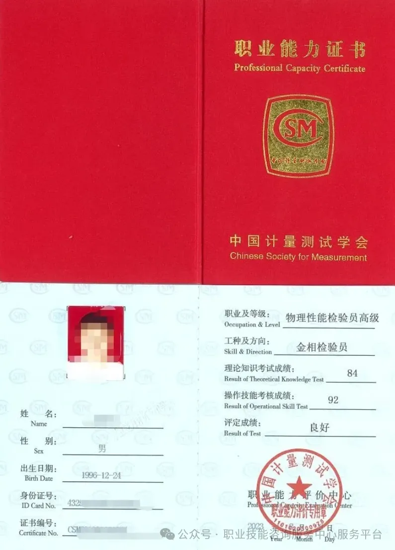 证书是由国家市场监管总局直属机构中国计量测试学会颁发的职业能力等级证书,证书终身有效,无需年审,全国通用,权威性强,官网可查,可作为求职、晋升、招投标资质。
