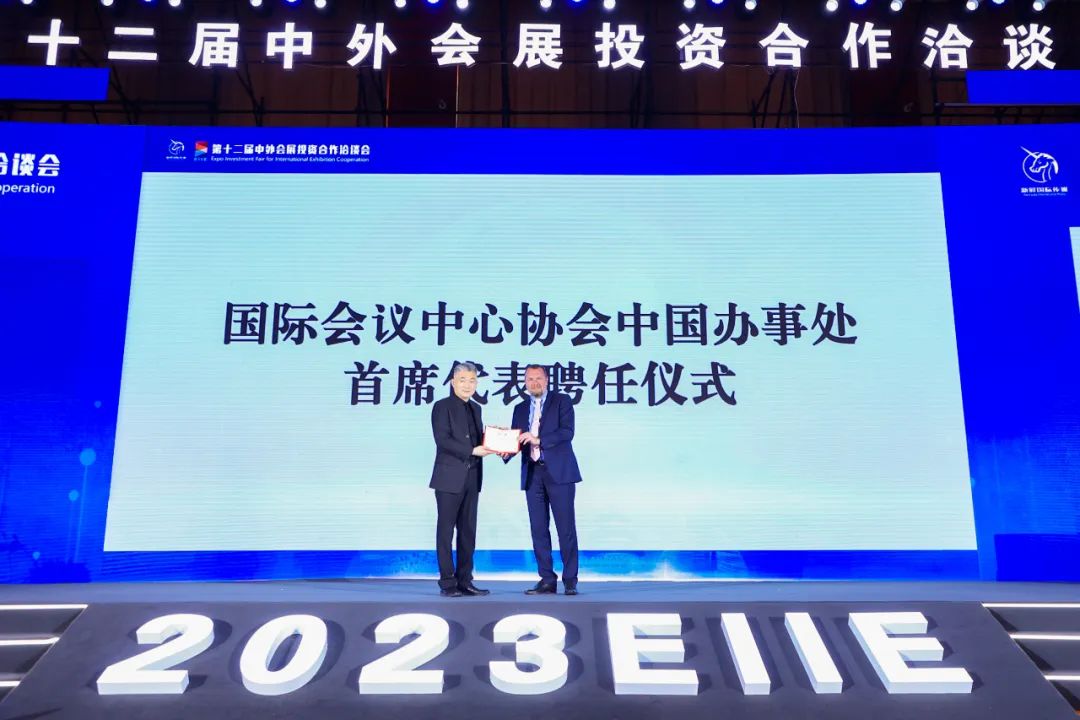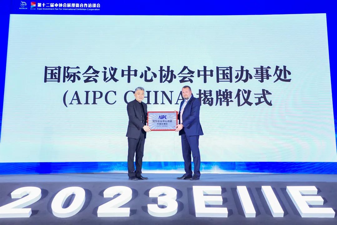 开幕式期间还隆重举行了国际会议中心协会中国办事处(AIPC CHINA)揭牌仪式,新展国际传媒有限公司将作为AIPC的中国办事处,Sven Bossu亲自给新展国际传媒总裁赵伟颁发了国际会议中心协会中国办事处首席代表聘书。