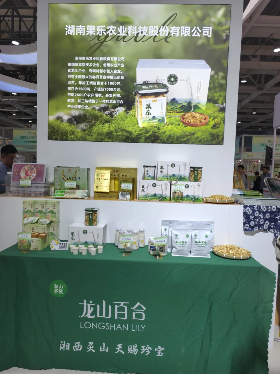 果乐农业作为国家高新技术企业、省级农业产业化龙头企业,携旗下多款百合系列产品亮相展会。展位前人头攒动,龙山百合干片、百合植物饮料以及百合解郁安神胶囊等产品吸引了众多专业观众驻足咨询。公司“不硫熏、自然微苦”的绿色加工理念和全产业链发展模式,得到了种植户、药企代表及行业专家的认可。