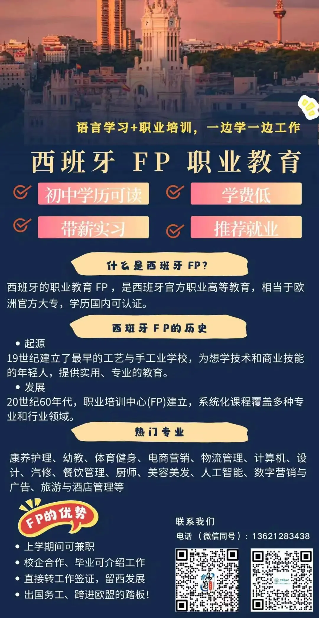 西班牙 FP(Formación Profesional)是西班牙教育部官方高等职业教育体系,相当于欧洲大专层次,具有以下优势: