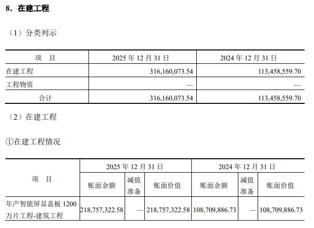 新吴光电报告期各期末在建工程余额从4633万元飙升至31616万元,占总资产比例从11.15%升至47.63%,核心为“年产智能屏显盖板1200万片”项目,且设备采购供应商与群创光电、友达光电等客户重叠,实控人还受让了供应商2%股份,引发监管对交易公允性和资金闭环的质疑。