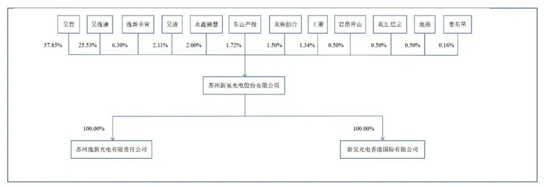 新吴光电由吴哲、吴逸谦父子共同控制,合计持股89.68%,关联方吴洁担任两家企业高管,监管层重点关注控制权稳定性、同业竞争及关联方代垫成本问题。