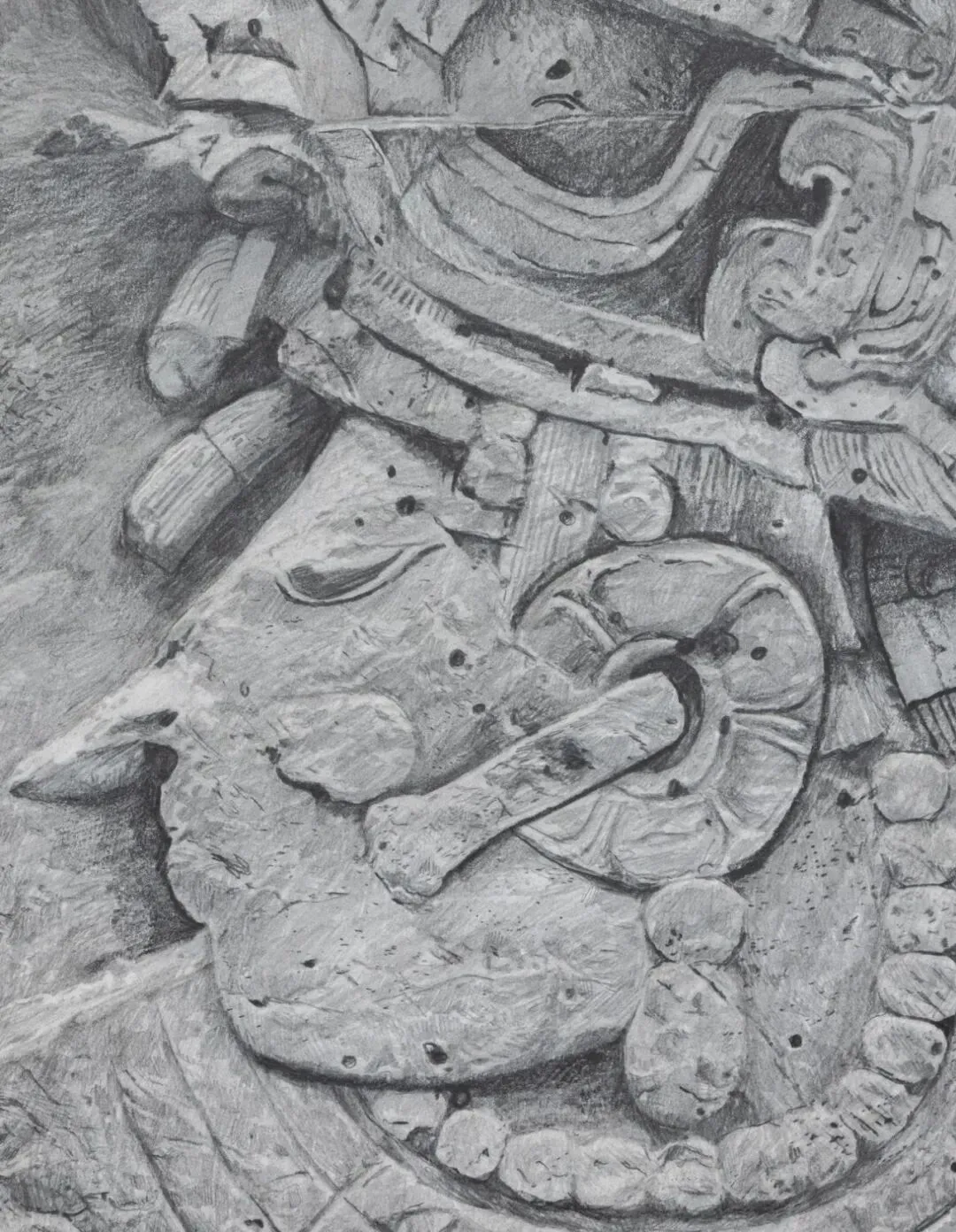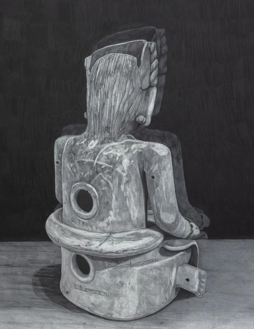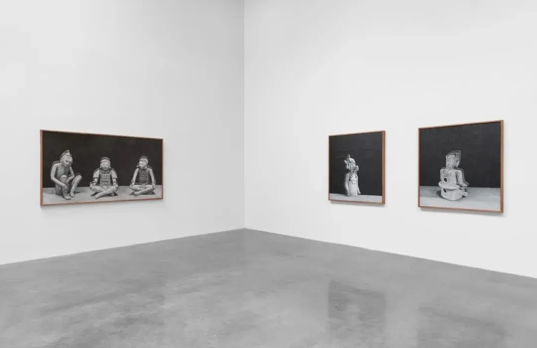波拉斯-金创作了一系列这些雕塑的石墨画,画面背景是经过细腻处理的石墨场域,起到了镜面的作用。物件与它们自身的倒影并存,如同图像旁泛起的轻微回响。这种微妙的镜像引入了一种双重性,暗示了物件与其过去形象的关系,并突显了拉拉的作品如何在当下占据古代物件的位置,从而消解了时间距离。