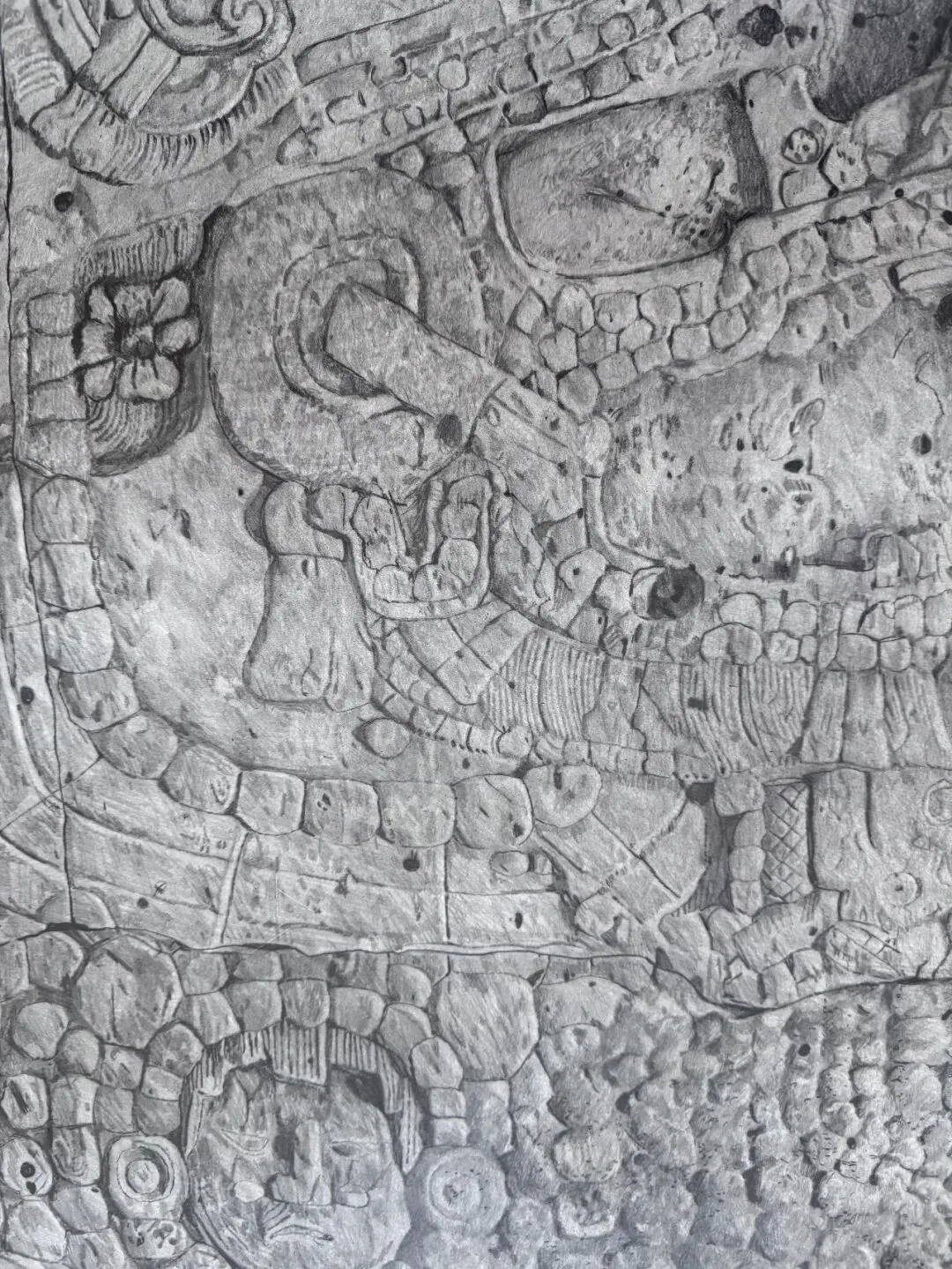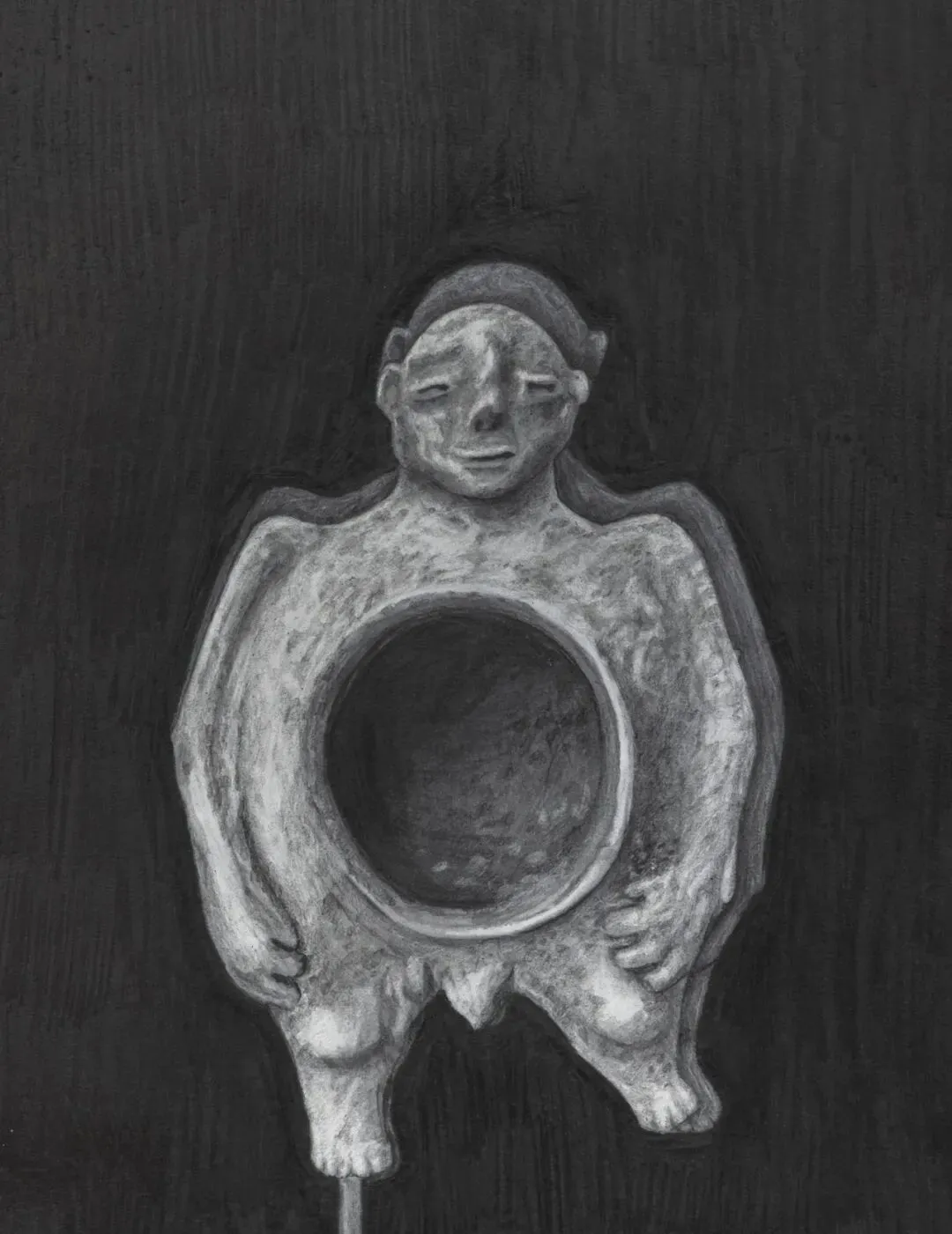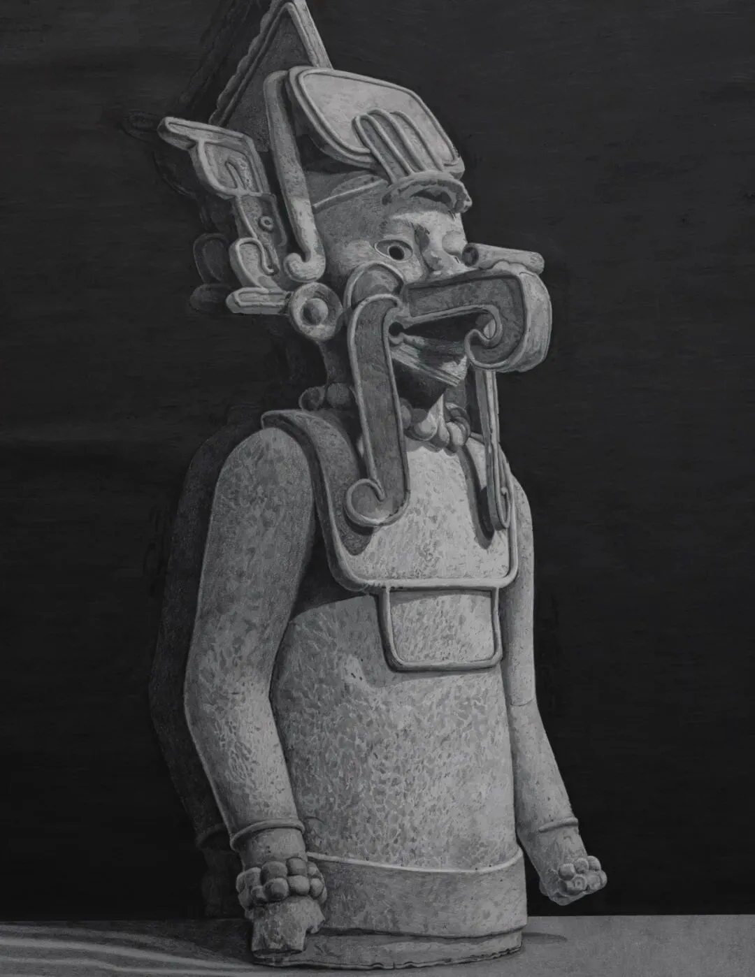 波拉斯-金创作了一系列这些雕塑的石墨画,画面背景是经过细腻处理的石墨场域,起到了镜面的作用。物件与它们自身的倒影并存,如同图像旁泛起的轻微回响。这种微妙的镜像引入了一种双重性,暗示了物件与其过去形象的关系,并突显了拉拉的作品如何在当下占据古代物件的位置,从而消解了时间距离。