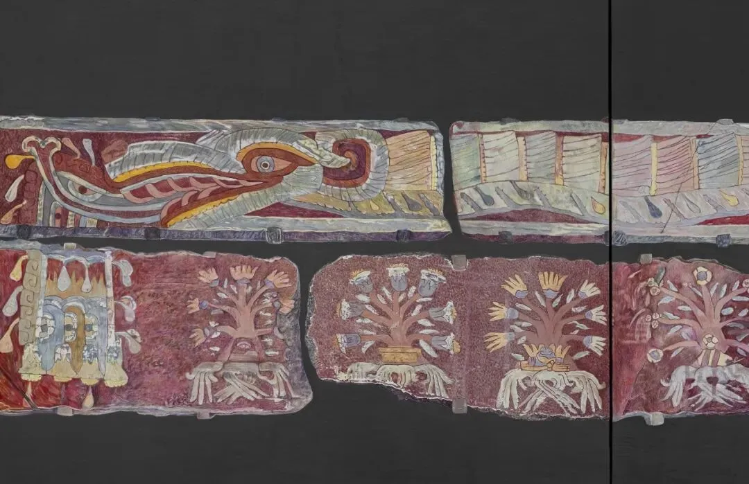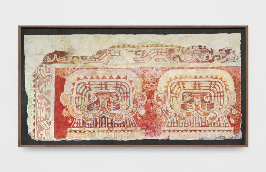 在气候展厅外部的墙壁上,悬挂着复制自特奥蒂瓦坎(Teotihuacan)特钦安蒂特拉(Techinantitla)建筑群墙面装饰的彩色绘画。该遗址的壁画曾被凿成碎片并在黑市出售,随后于20世纪60年代进入美国、墨西哥和欧洲的私人收藏和博物馆。这些图像最初是作为建筑表面的组成部分创作的,如今却被碎片化并作为独立的艺术品重新编目。它们以博物馆标准的平视高度进行展示,移位了其原本接近地面的空间导向。