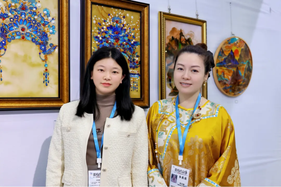 展会现场,展位上掐丝珐琅、扎染服饰、绕线工艺戒指及AI文创创新成果等各具特色的非遗作品琳琅满目,吸引了许多观众驻足和体验。工作室成员担当讲解员与演示者,凭借专业知识细心、耐心地介绍展品,使其全貌得以展现,为参观者带来了丰富多彩的文化体验。展会期间,工作室与多品牌方达成合作意向,这既为工作室提供丰富资源与支持,也助力学院教学实践,推动学校非遗领域教育教学改革发展。