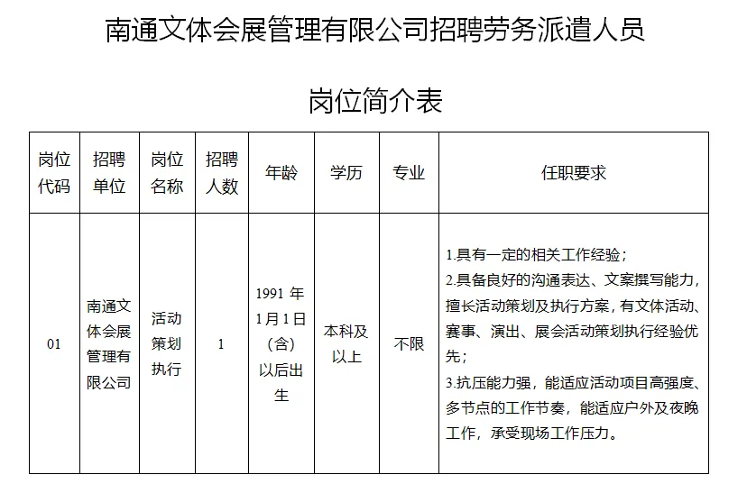 详见《南通文体会展管理有限公司招聘劳务派遣人员岗位简介表》(附件1)。