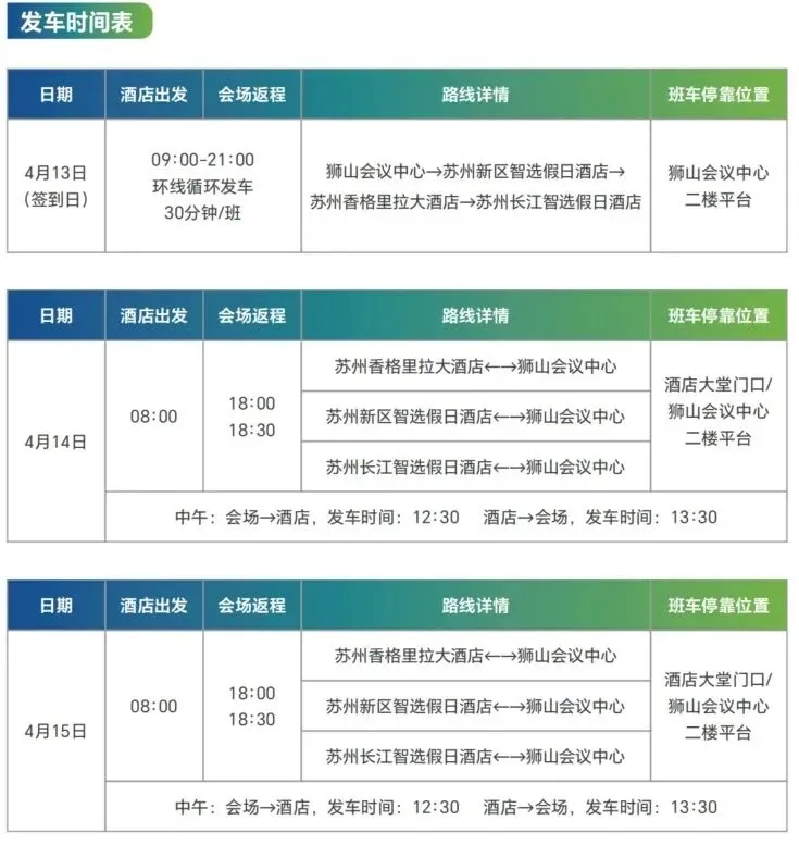 合作酒店与会场之间的班车接驳服务如下表。请提前5分钟到达班车停靠位置。